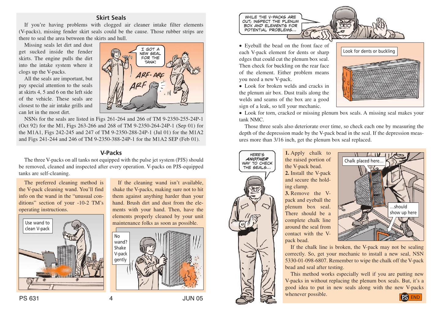 If you’re having problems with clogged air cleaner intake filter elements (V-packs), missing fender skirt seals could be the cause. Those rubber strips are there to seal the area between the skirts and hull. Missing seals let dirt and dust get sucked inside the fender skirts. The engine pulls the dirt into the intake system where it clogs up the V-packs. All the seals are important, but pay special attention to the seals at skirts 4, 5 and 6 on the left side of the vehicle. These seals are closest to the air intake grills and can let in the most dirt.