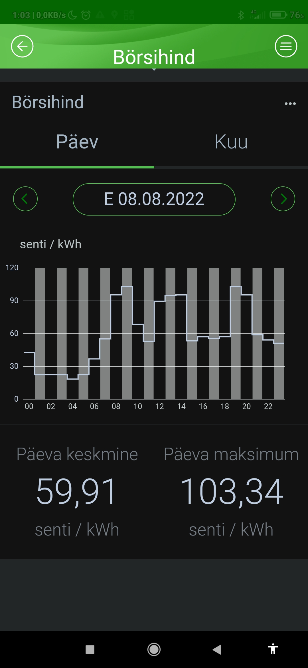 EE äpp annab meile homseks uhkema pildi, kus on näidatud elektri hind koos käibemaksuga. 1,033eur/kWh.