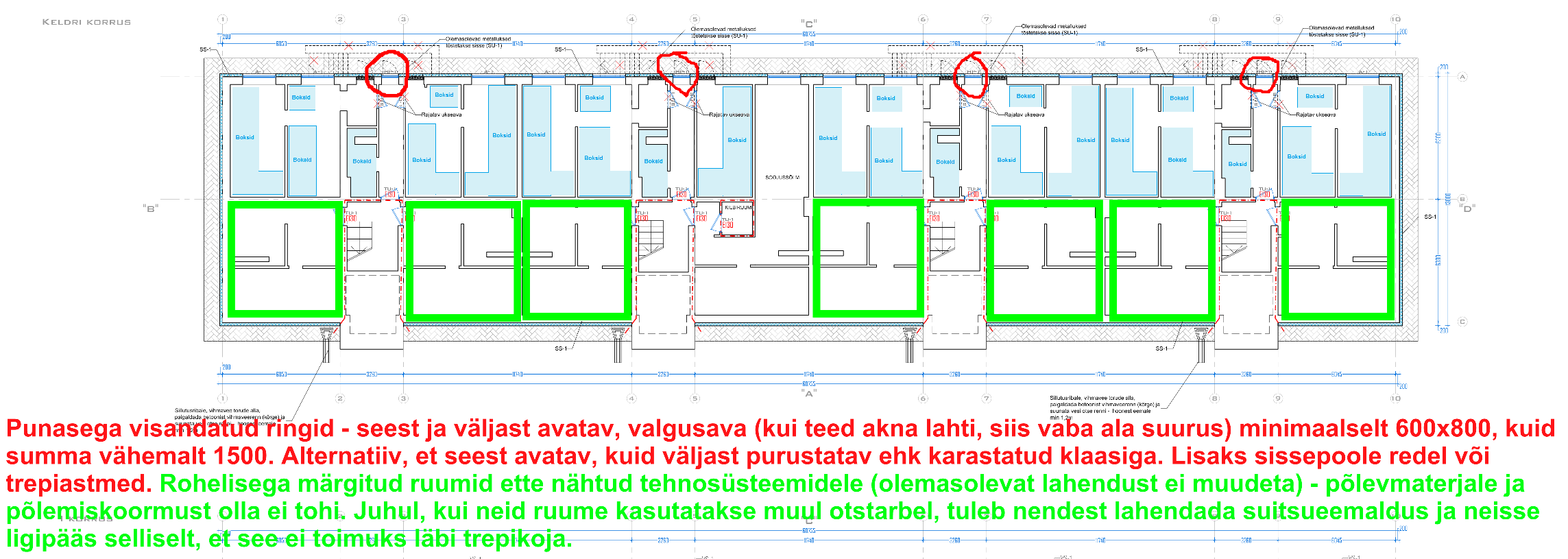 Joonis on võetud tuleohutuse eksperthinnangust (tellisime, sest käis vaidlus Päästeametiga) ja need punase ja rohelisega tekstid on tipptasemel tuleohtusspetsialistide kirjutatud.