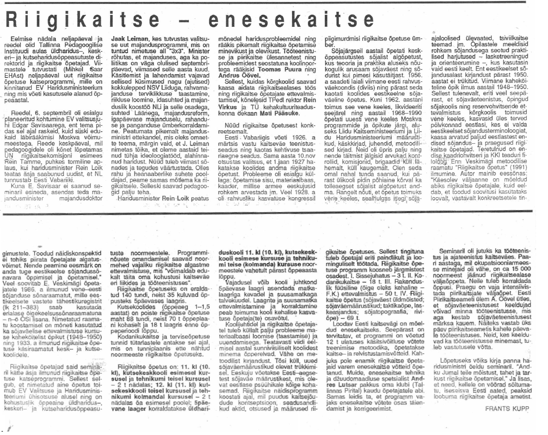 Mingitlaadi "riigikaitse õpetust" või nii. Kuna mina näen selles nn "riigikaitse õpetuses" kahte võrdselt tähtsat aspekti, sõjalised ja tsiviilkaitselised algteadmised ning isamaaline kasvatus, siis 90-ndate alguses selle teise aspektiga erilisi probleeme ei olnud ja isamaalis-patriootlike väärtushinnangute eraldi noortele õpetamist nii väga vaja ei olnudki (ei olnud karjuv vajadus selle järele).