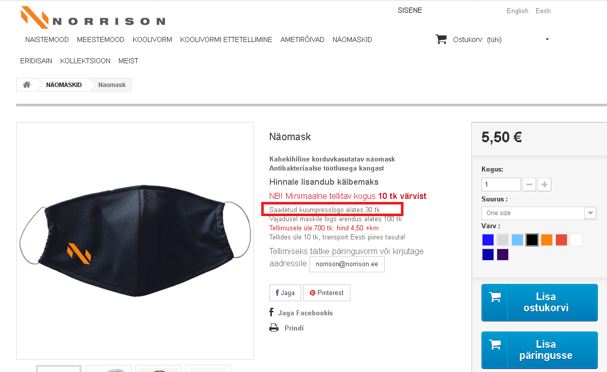 https://tarbija24.postimees.ee/6945714/ ... -kuum-kaupReimand omalt poolt kinnitas, et Euroapteekidesse tulevad maskid nende oma varustusliini pidi. Sedapuhku tulid nad Leedust ehk erineva tarne kaudu, kui said hulgimüügifirmad Magnum (tarnib Apothekadele) ja Tamro Eesti (tarnib Benule), kes said kaitsemaskid ettevõttelt Semetron. Tarnekindlust Reimandi sõnul lähiajal oodata ei ole – lähipäevil tuleb neil Leedust veel üks partii, aga peale seda peab jooksvalt vaatama, kust ja milliste tarneprognoosidega saab.