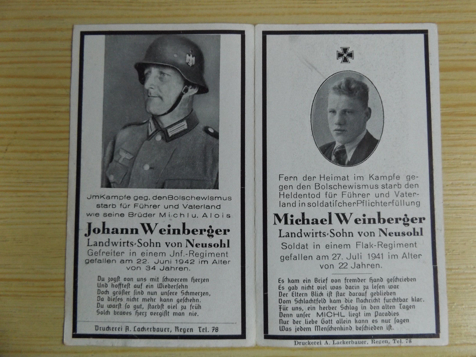 gefallen/gestorben am 22. Juni 1942 (Johann), am 27.Juli 1941 in Painkula/ Osten (Michael) und am 1. Sep. 1941 bei Korap/ Osten ( Alois)