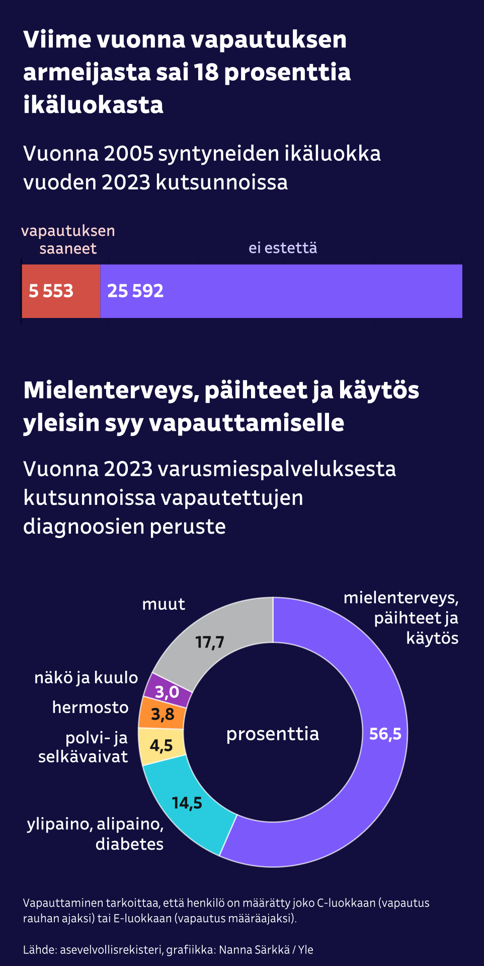 Soome ajateenistusse kutumise probleemidest. 2023. aastal ei läbinud tervisekontrolli 18%. Läbi aastate suureneb vaimse tervise ja sõltuvusainete osakaal.