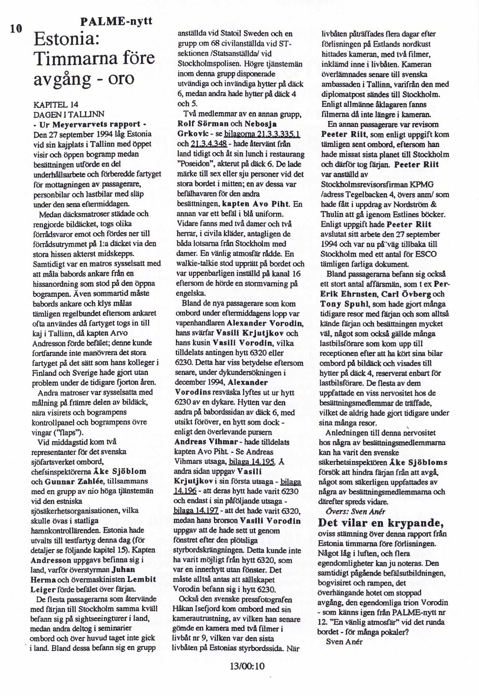 Tänud Fucsile suure töö ärategemise eest, Leivo protokollid olid ka lausa lust lugeda, kuidas Liim juba tollal oma vandenõuteooriatega mitte vinti üle keeras, vaid suisa kaks vinti peale keeras ning Klandorf lobises kõigist kuulujuttudest, mis vähegi tema kõrvu olid jõudnud. Vaadates millise infotulvaga komisjon üle valati, siis pole ime, et ametlik kokkuvõte neile järjest kahtlasem tundus, kuid tundub, et ka ametlik uurimine oli tollal ikkagi korralikult Eesti seisukohast kiivas Rootsi poole ehk meie, rahatud aborigeenid, vormiliselt küll juhtisime uurimist, kuid tegelikult purjetasime swenssonite kiiluvees ja toitusime infokildudest, mida nad pidasid vajalikus meiega jagada. Lisaks lonkas meiepoolne organiseerimine kahte jalga, ei nõutud endale tuukritööde lindistusi, ei oldud juures silla sukeldumisel, ei nõutud sillal olevate laipade identifitseerimist jne jne jne.