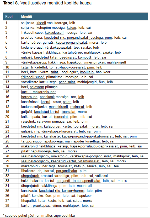 Toon välja sealt kontrollpäeva menüüd erinevates kontrollitud koolides ja kokkuvõtva analüüsi menüüdest.
