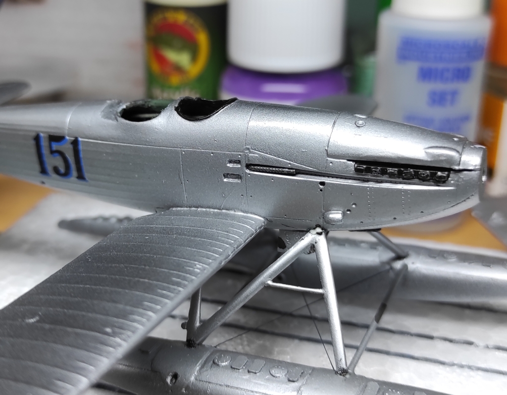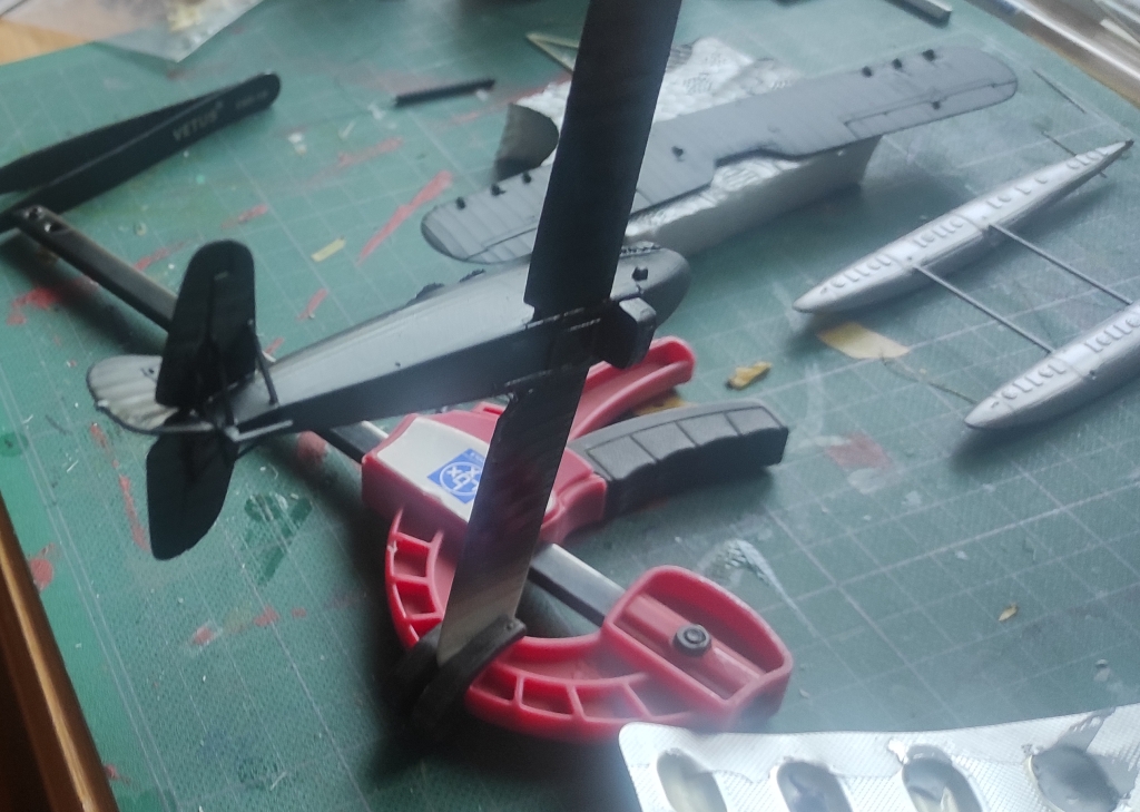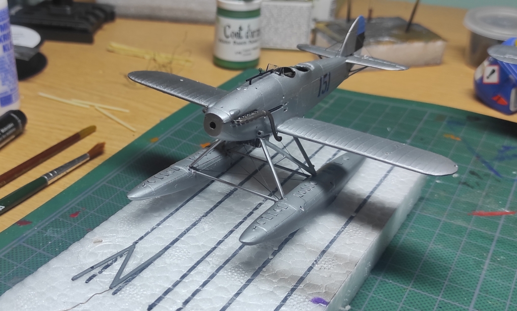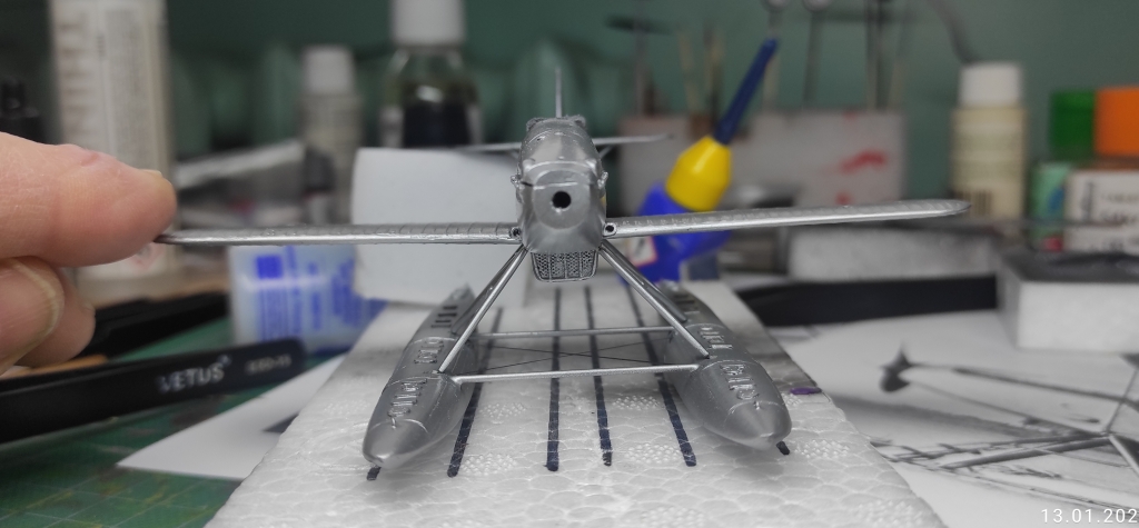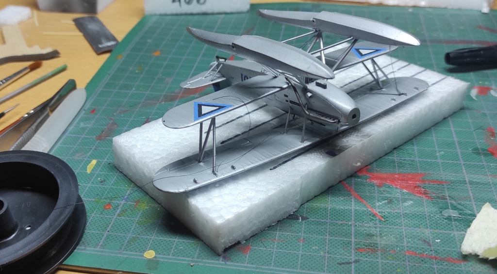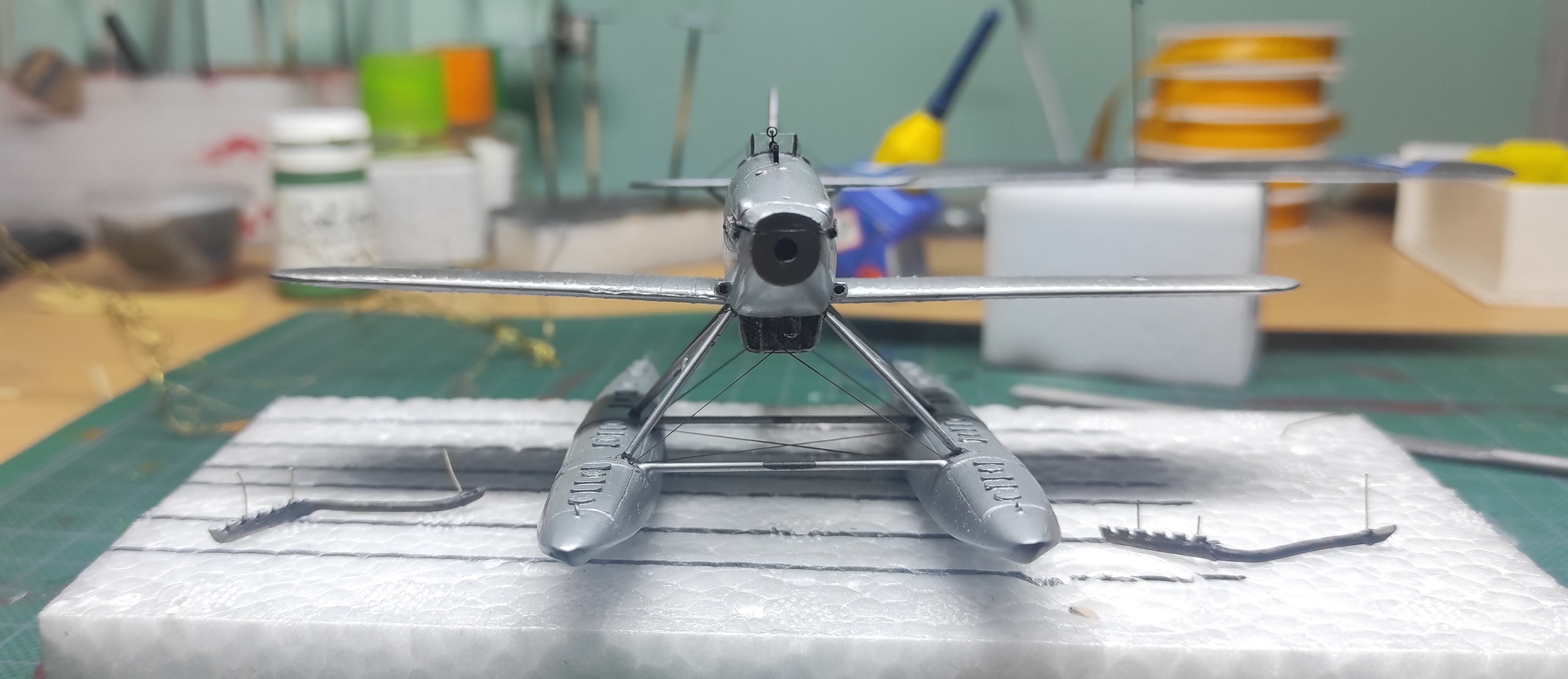 Aga edasi, ämblikut tegid oma töö ära: aeg oli lisada veel nipetnäpet , nagu antennid , tuled ... sellele pildile jäi kütusepaagi õhutustoru : ja viimase asjana lisandusid pootshaak ja pontoonidele köis. Jällegi, pea igal fotol oli üks neist alati kohal ja enamusel olid mõlemad esindatud. Pootshaaki oli kusjuures osadel fotodel ka bambusvarrega , oli suur ahvatlus aga 1/72 bambusvars ei tulnud just mitte kõige parem, läks tavaline rehavars . Köis tehtud niidist mida sai mitu korda läbi svammi sikutatud, svamm oli eelnevalt gatori liimi vesilahusega immutatud ( suhe umbes 1:20 le vee kasuks), ise jäin täitsa rahule , erilisi peeneid udeme karvu nagu ei paista.