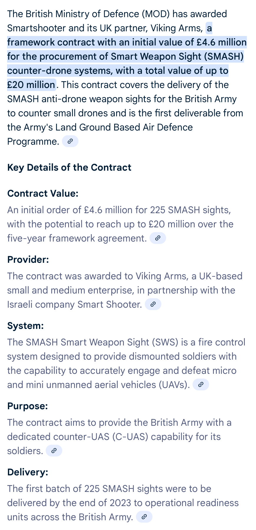 Kui see AI vastuses olev info vastab tõele, et 4,6 milj naela eest tuli 225 sihikut, on tk hinnaks u 20 000 naela.