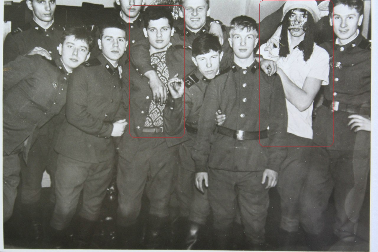 Keskmine härra, kaunis rahvusliku tikandiga bandeeralikus kampsunis, on (toona veel vanemseersandist) ukrainlane (pool ukrainlane-isa poolt ja pool ungarlane-ema poolt) ja paremalt teine härra on... khmm... kuidas seda nüüd viiskalt ütelda... proua? - no kuigi nõuka ajal ei istunud need, kes ennast n.ö. teisest soost, kui issand andis, tundisd olevat, mitte lihtsalt kapis vaid pigem kusagil GULAG-is, siis näed üks selline isend sattus ka meite sekka juba sügaval nõukaajal. Daamil-härral võib formaodeždas muidugi märgata ka teatud sarnasusi ja vihjeid teatud lõunamaade rahvuskultuurile või siis isegi lillelastele vms [vt nt Mr.Sofa & Õieke], aga olukorda teades saan kinnitada, et härra on seal muskuliinses läbi ja lõhki meeste seltskonnas siiski kehastunud proua daamiks...