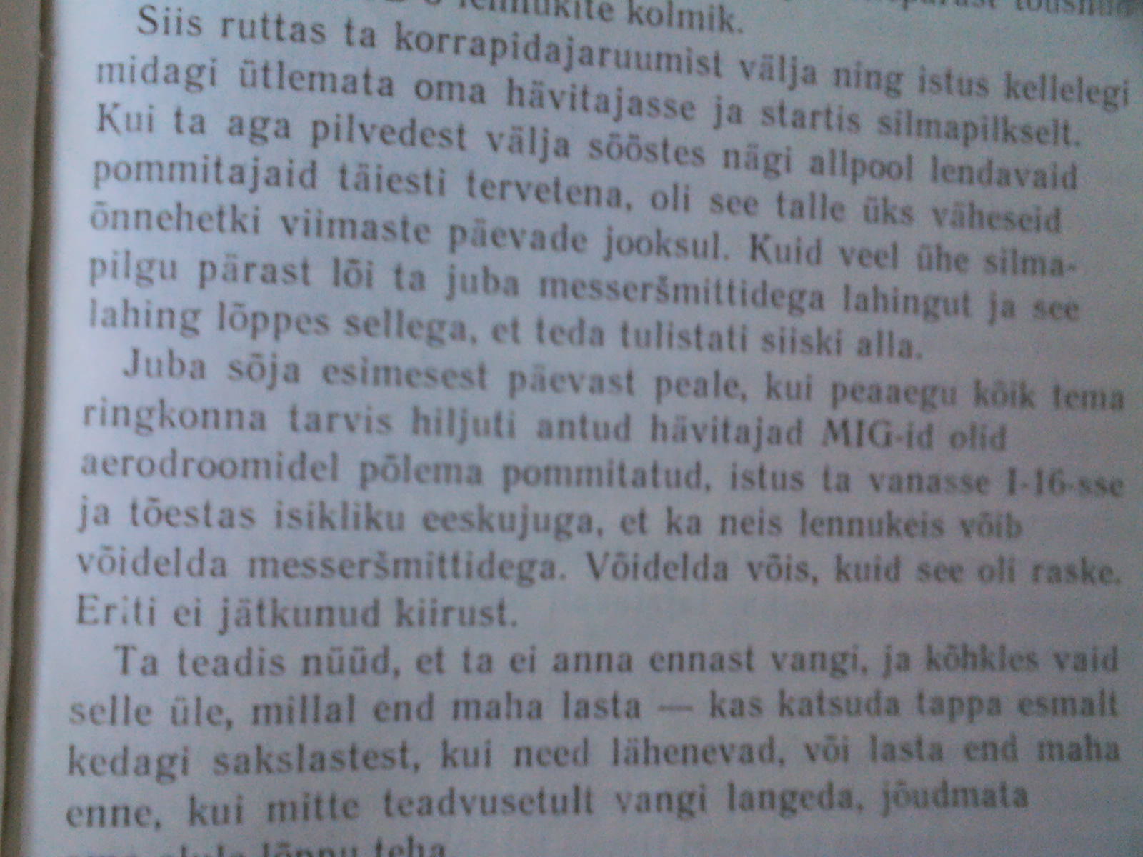 Kaugpommitajate pääsemist esimeste päevade sakslaste õhurünnakutest lennuväljadele üldistada kogu NSVL lennuväele - pole paha. Ise tulid selle peale või jälle Solonin?Kapten Trumm kirjutas:Ajastule tüüpiline kirjeldus õhusõjast 1941 juunis (jupike pikemast Simonovi artiklist TB-3-de massitapust sakslaste poolt, minuvanused on seda raamatut ilmselt lugenud ka (Sõja eripalgelised päevad). Solonin siin eksib - "ootamatu löök magavatele lennuväljadele" ei mõeldud välja mitte Jeltsini Venemaal, vaid see "tõde" oli leiutatud juba sügaval NSVL ajal (antud raamat oli trükitud vist 1986 või midagi sellist).