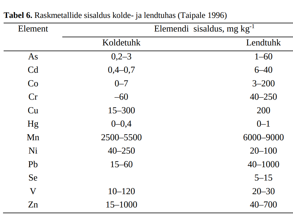 Siin on näha, et kui suures ulatuses on mõõdetud erinevate ainete sisalduse varieerumine ühe kolde kahes erinevas tuhaliigis, klodetuhas ja lendtuhas. Tuha sisalduse numbrite võrdlejatele teadmiseks, et katlamajade biokatelde koldetemperatuur ei tohi ületada +950C, sest siis suureneb NOx sisaldus suitsus.