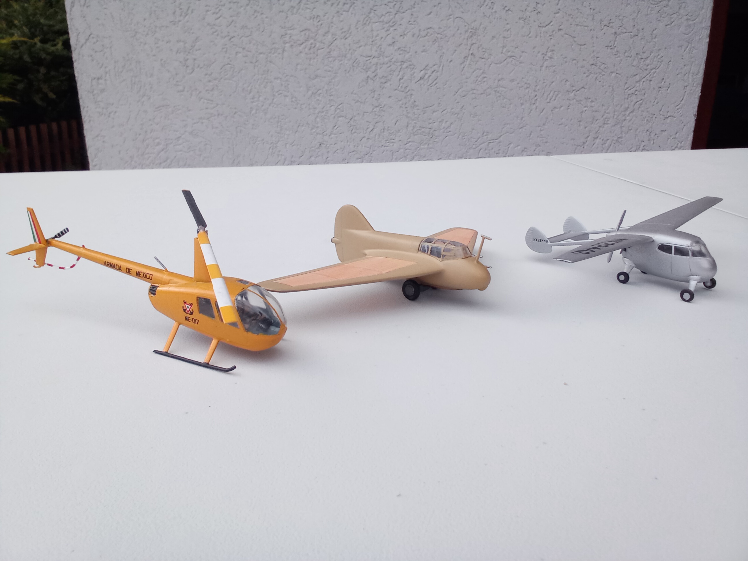 No siis veel üks pilt, kus rohkem kui üks lennumasin peal. Robinson R44 Mehhiko versioonis (tootja Kovozávody Prostejov), Me 163 eelkäija- DSF 194 (PM models) ja Stout Skycar II (tootja AVIS). Viimane- tõsi küll ilmselt ei mahu 100% militaarmudeli kategooriasse. Aga kuna siin kategoorias on enne ka aegajalt mõni mitteväga militaarne lennuk olnud...no las siis olla.