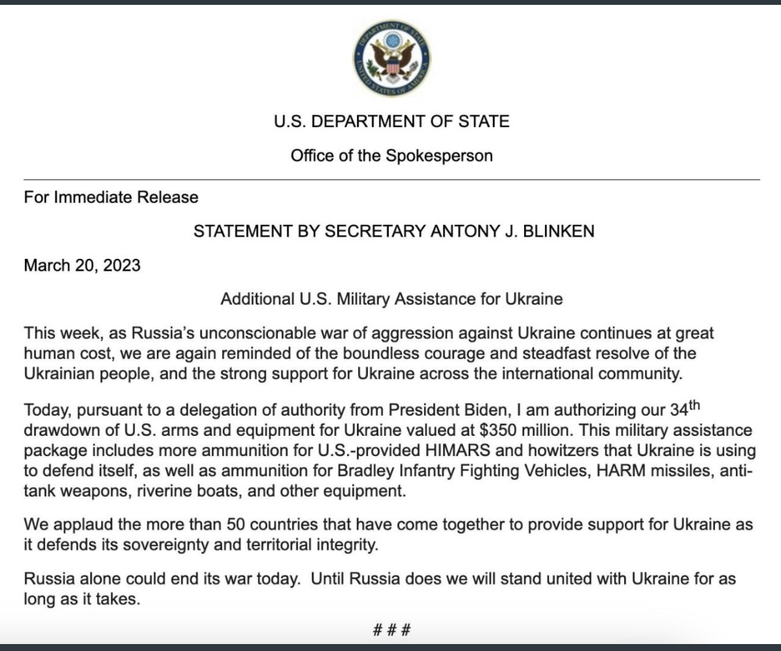 "In the coming days you will see another military aid package from the United States, and I think you will see in this package the types of assets, weapons and ammunition that we believe will be vital to Ukraine's success in the coming weeks and months" - John Kirby