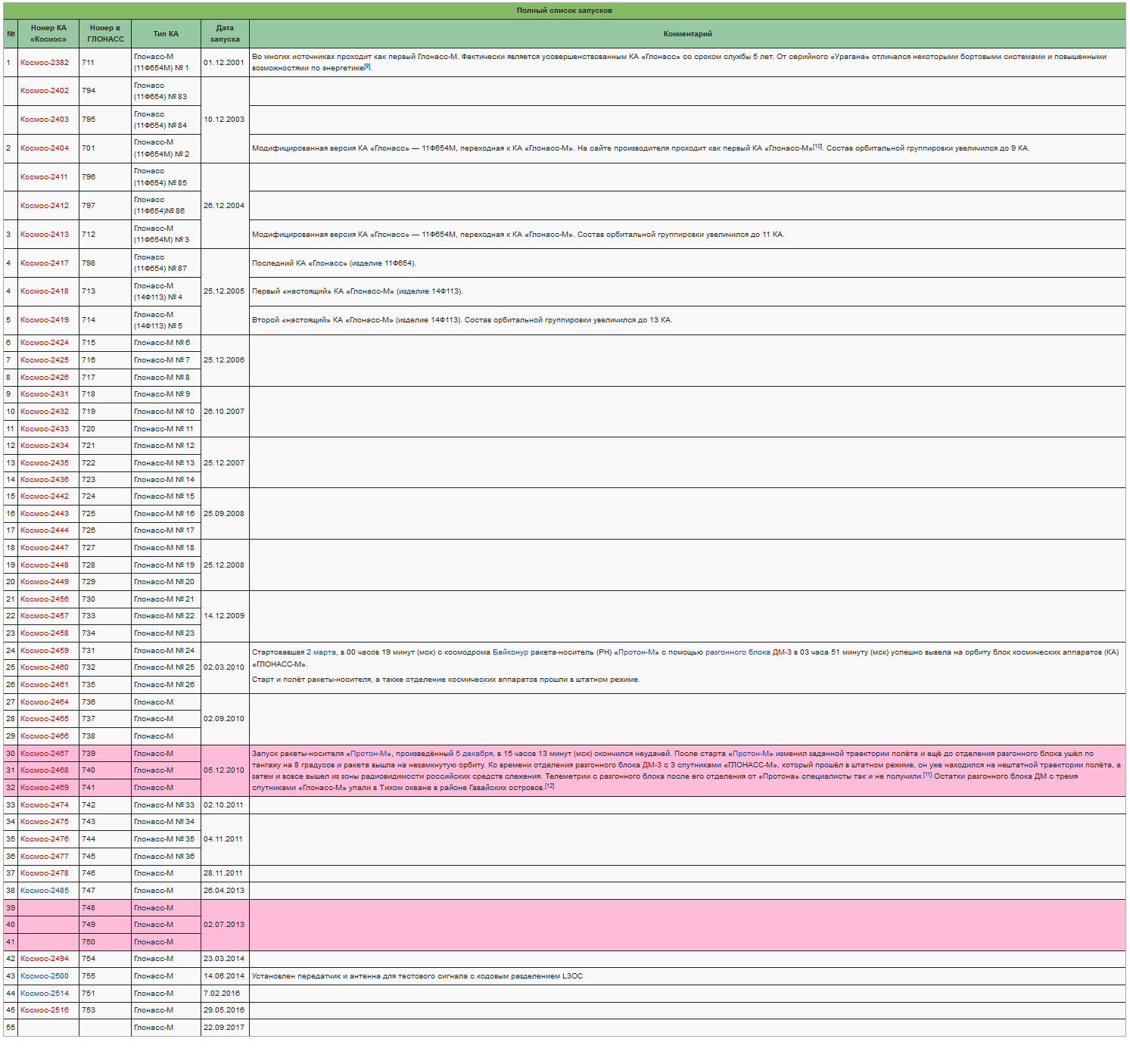 GNSS süsteemide võrdlustabel GLONASS sattide numbrid ja andmed (praegu on rivist väljas satid nr.723 [GN 76] ja 734 [GN 69]) * 723 oli venelastel enne 2016 sügist orbitaalreservis ja asendas 2016 sügisel rivist välja langenud satti 737