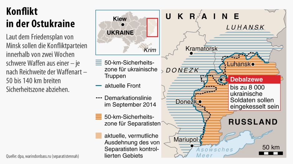 Wir warten noch auf zwei Konvois“, sagte Poroschenko. Die ukrainischen Einheiten hätten mit der Verteidigung Debalzewes ihre Pflicht erfüllt und der Welt „das wahre Gesicht der Banditen und Separatisten gezeigt, die von Russland unterstützt werden“.