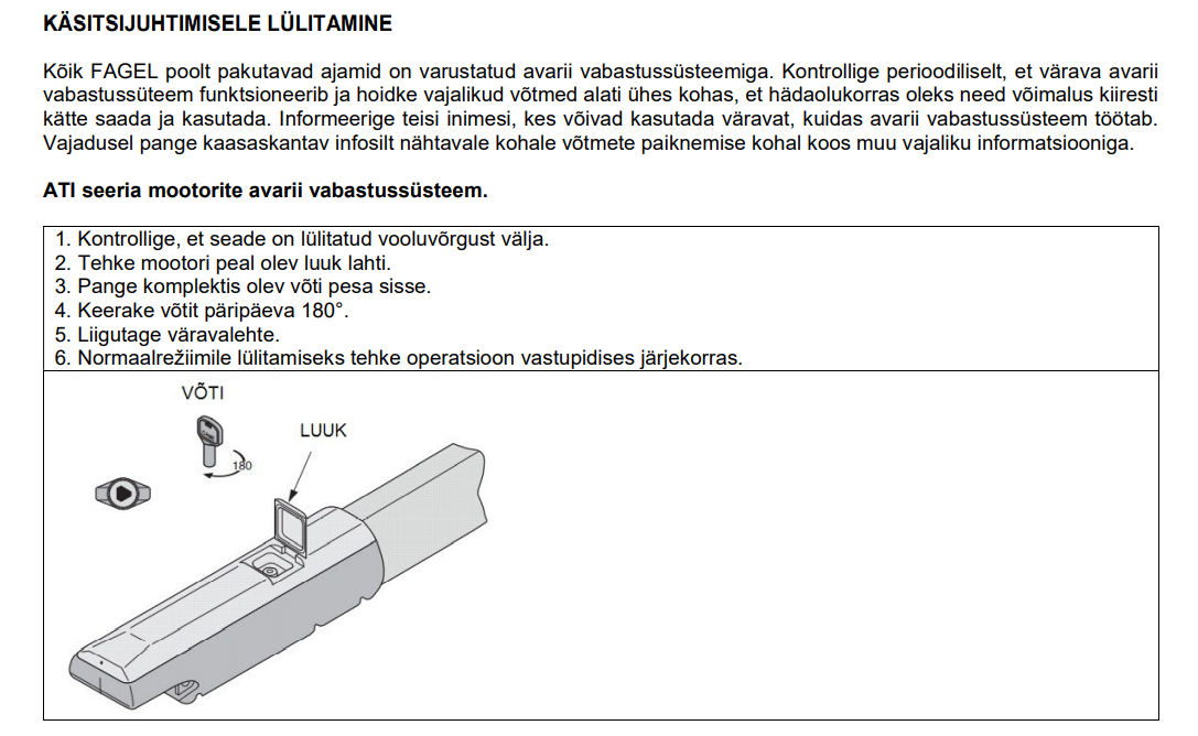 Sellel peaks raudselt mingi avarii-käsitsiavamisvõimalus ka olema. Mul kunagises töökohas oli suur elektriline autovärav, tolle mootoril (firma FAAC) oli külje peal ümmargune kummist kork. See tuli maha tõmmata, all oli kolmnurkne ava. Sinna tuli vastav kolmkantvõti sisse pista ja keerata. Sedasi sai mootori väravast lahti haakida ja väravat sai käsitsi lahti-kinni lükata. Pärast, kui vool tagasi tuli (või oli lihtsalt vaja väravat lukustada), tuli sama võtmega üks klõps teistpidi keerata ja oligi mootori hammasratas jälle värava hammaslatiga ühendatud. Selline plastmassist, vändakujuline võti oli, umbes laste jalgratta pedaali mõõtu.