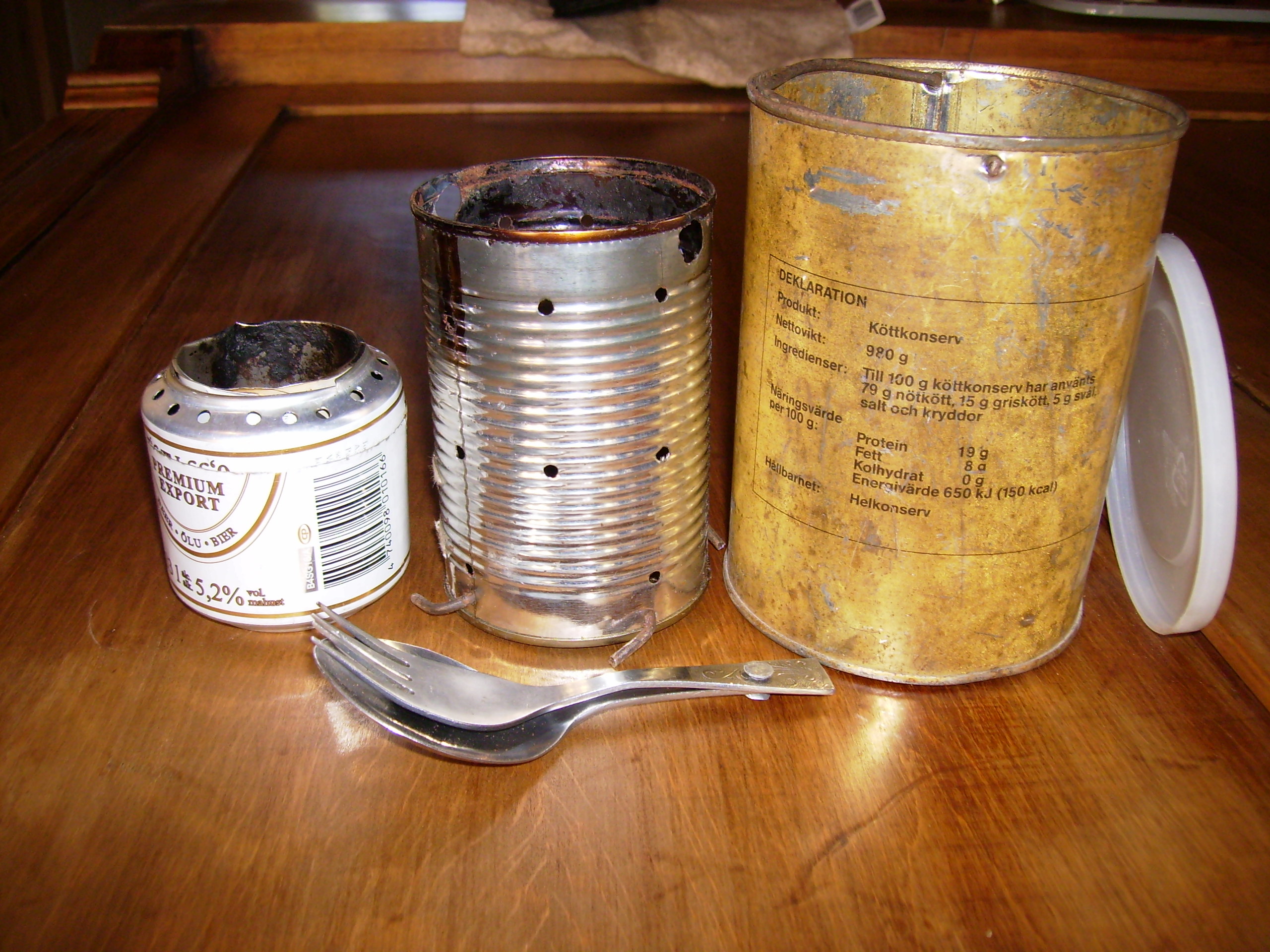 selliseks kiireks, odavaks ja lihtsaks veenõuks sobib plastkaanega suletav nescafe lahustuva kohvi purk (aga seda ma olen ilmselt juba kirjutanud). põleti ja traadist jalad ning fooliumist tuulekaitse sinna sisse.