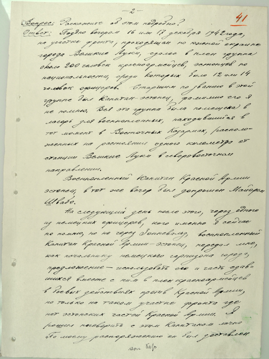 Протокол допроса военнопленного, бывшего начальника гарнизона г. Великие Луки подполковника фон Засса Эдуарда Георга с предъявлением ему обвинения в военных преступлениях