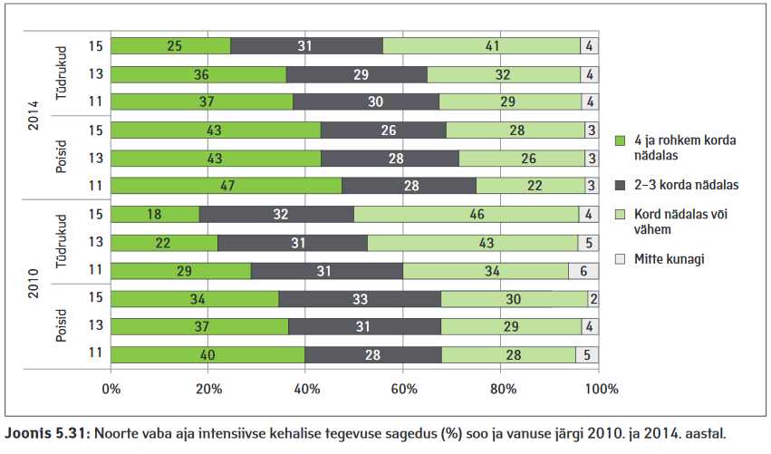 Kui 2010. aasta tulemuste põhjal ei tegelenud vabal ajal sportliku tegevusega üldse ligikaudu 5% tüdrukutest ja 3% poistest, siis 2014. aastal on inaktiivsete poiste hulk jäänud samaks ja tüdrukute hulk langenud 4%-le. Vanuse kasvades suureneb noorte hulk, kelle vabal ajal harrastatava kehalise aktiivsuse sagedus on vaid kord nädalas või harvemini. Kui 11-aastaste poiste ja tüdrukute seas oli vähemasti 4 korda nädalas harjutajaid vastavalt 47% ja 37%, siis 15. eluaastaks oli selliseid noori poeglaste hulgas 43% ja tütarlaste hulgas vaid 25% (joonis 5.31).