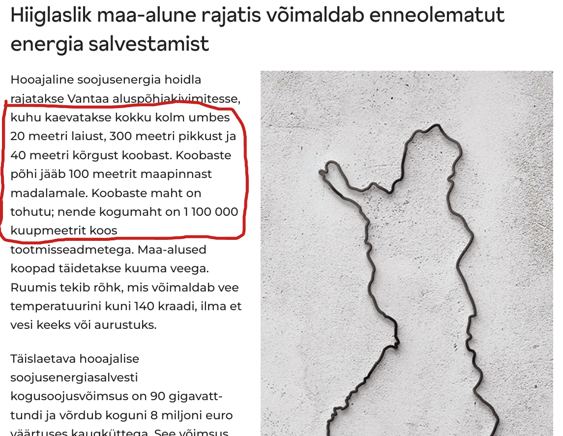 P.S. Artiklis on kirjas, et soojusenergia hoidla jaoks rajatakse 3 umbes selliste mõõtudega koobast. Ja lisana on lause, et koobaste kogumaht on meeletu, koos seadmetega 1 100 000 kuupmeetrit.