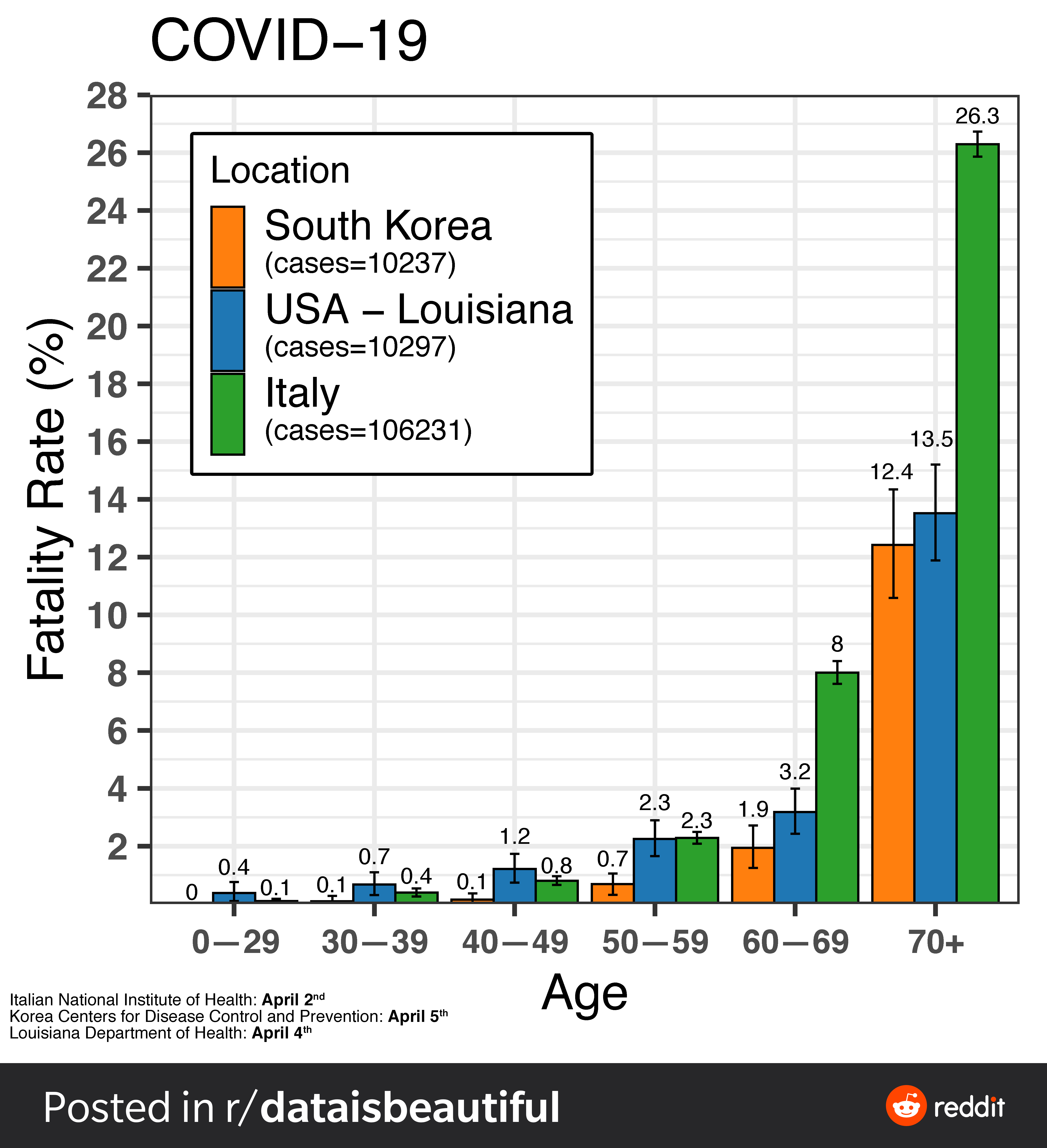 Nähes, et Louisiana puhul on noorema populatsiooni(0-49) seas suremus suurem, kui on seda Itaalias ja Lõuna-Koreas, siis ma järeldan seda USA suurema hulga ülekaaluliste ja diabeedihaigete tõttu võrreldes teiste inimkultuuridega. Suhkur ja töödeldud rasv on USA toidukultuuris au sees, Euroopas pigem mitte.