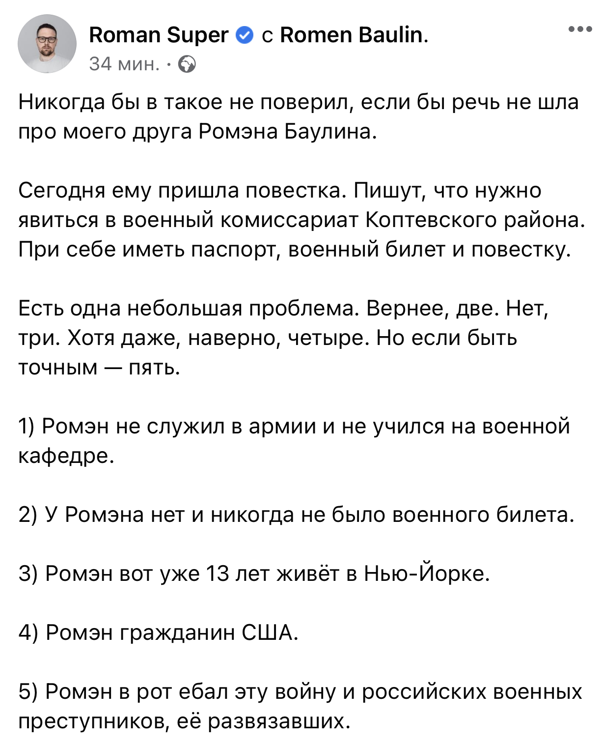 Južno-Sahhalinskis prooviti ratastoolikasutajat sõjaväkke kutsuda. Pärast seda, kui ema ta sõjaväelise registreerimise ja värbamise büroo uste ette tõi, selgitasid nad, et linnas andsid kutsed üle administratsiooni töötajad, kuna sõjaväe registreerimise ja värbamise büroo ise ei saanud hakkama.