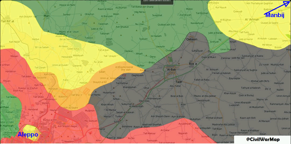 Kriku kirjutas:Eileõhtused ja tänased teated räägivad Türgi poolt toetatud FSA ja SDF-i kokkupõrgetest hiljuti ISIS-e käes olnud alal. Tõenäoliselt tahavad rohelised al-Babi kirdesuunal kurdidest ära lõigata.