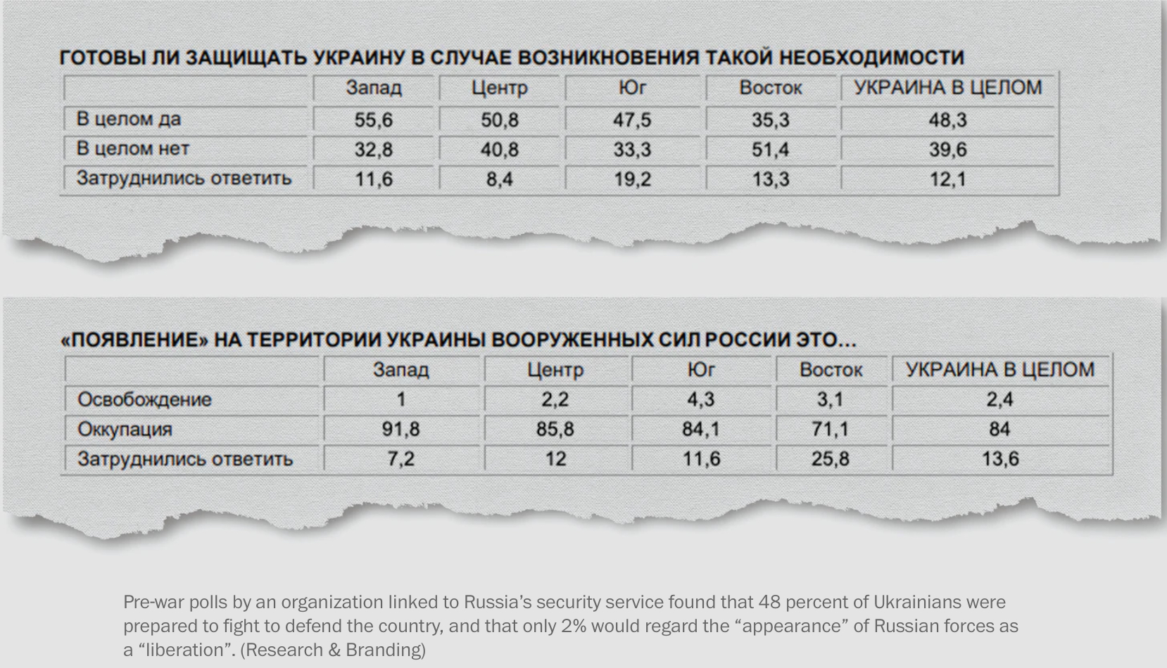 Hiljutised küsitlused, mille korraldas FSB-ga tihedalt seotud organisatsioon, näitasid, et Putin oli Ukrainas sügavalt ebapopulaarne ning Ukraina luure hankitud koopiate kohaselt on idee Vene vägede tervitamine väljamõeldis.