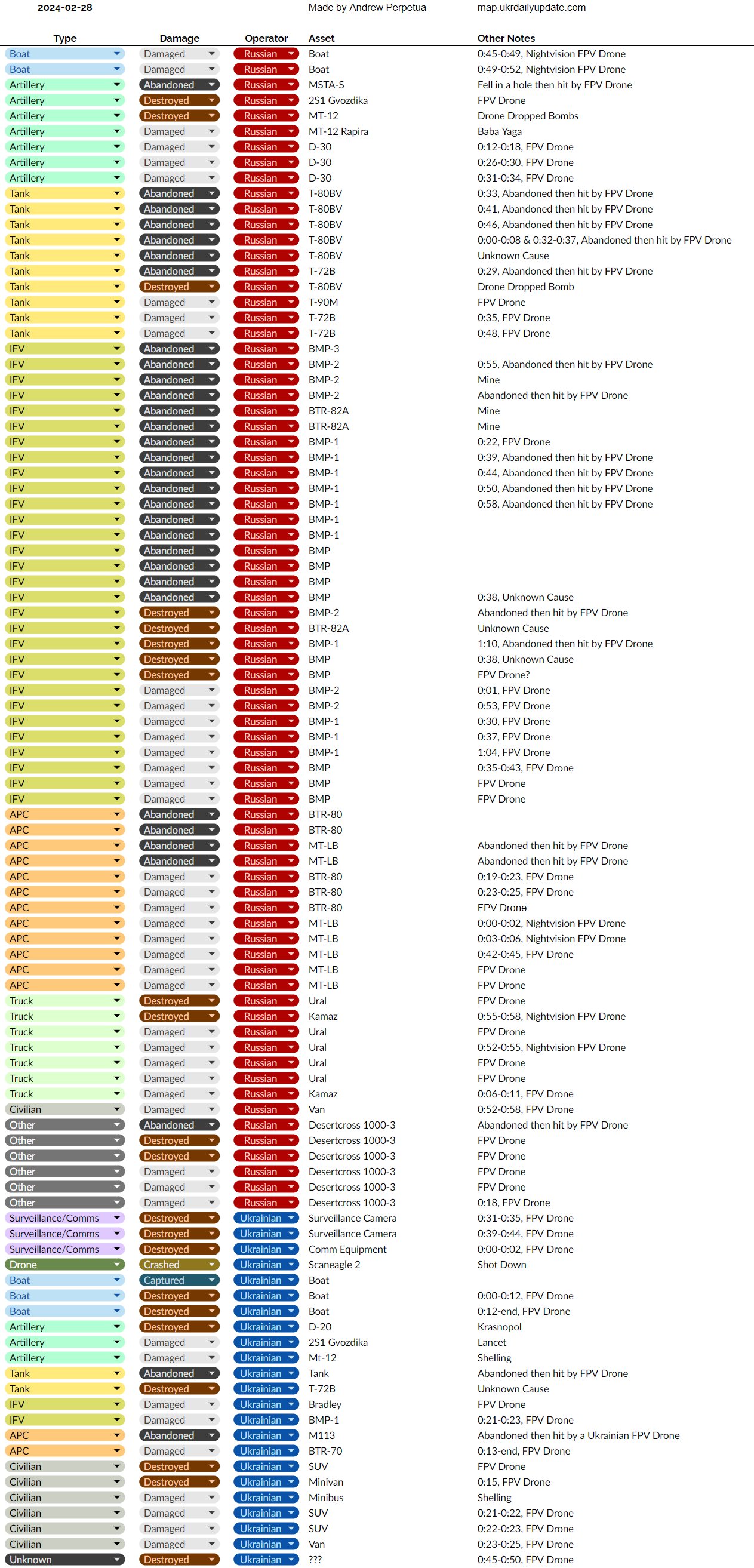EI tahtnud rohkem hetkel kommenteerida, aga:Mul ei ole spetsiifilist huvi ühegi kaotuse vastu üksikuna võttes. Ma ei näe ka, et mul oleks ressursi neid kõiki jälgida. Seega usaldan neid, kes seda teevad. Kas arvate , et oryx ei jälgi neid teisi allikaid ? Nad suudavad ka eristada vanu asju uutest. Ma ei suudaks ilmselt.Kairi kirjutas: ↑01 Mär, 2024 6:29Kui sul on spetsiifilised huvid, siis sa pead jälgima ka spetsiifilisi gruppe. Näiteks see rühm tegeleb ainult droonidega