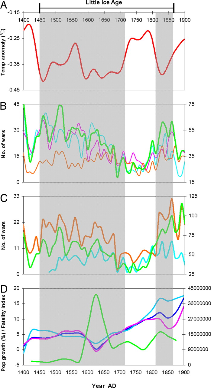 Zhang jt. 2007: https://doi.org/10.1073/pnas.0703073104 või http://www.pnas.org/content/104/49/19214Paleo-temperature variation, war frequency, and population growth rate, A.D. 1400–1900. (A) Temperature anomaly (°C) in the NH that is smoothed by 40-year Butterworth low pass filter (17). (B) Number of wars in the NH (bright green), Asia (pink), Europe (turquoise), and the arid areas in the NH (orange). ‖ (C) Number of wars worldwide as recorded by Wright (39) (turquoise), Luard (38) (orange), and Brecke ‖ (bright green). (D) Twenty-year population growth rate in Europe (turquoise), Asia (pink), and the NH (blue) ‖ and the NH 50-year fatality index (bright green). Cold phases are shaded as gray stripes. All war time series are in 10-year units, and the data are listed in SI Table 1. The bright green curves correspond to the right y axis.