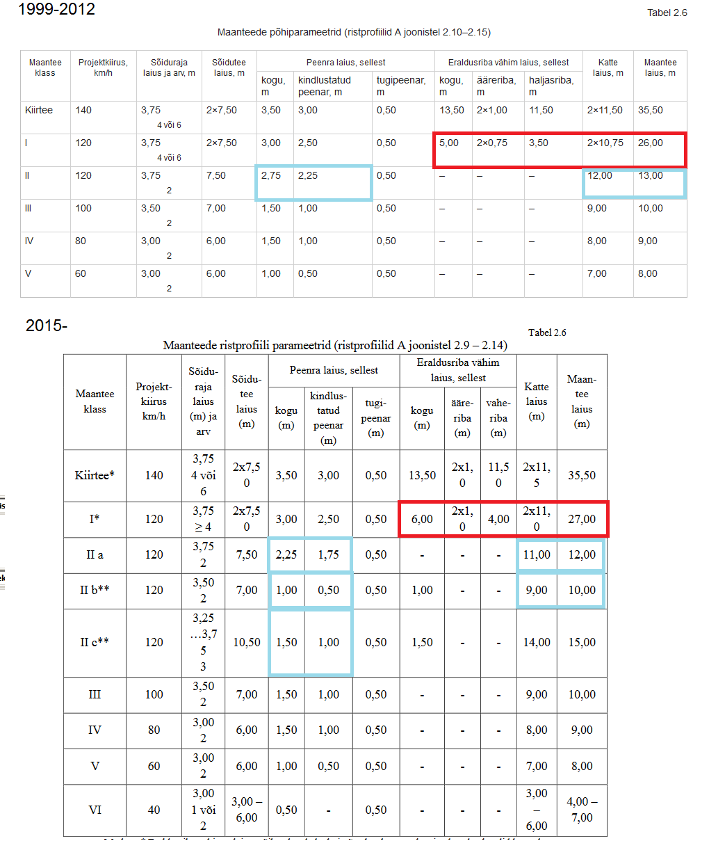 Toon sealt välje veel ristprofiilidele kehtestatud nõuete muutused. Seal tuleks lisaks pöörata tähelepanu "eraldusribadele", mis on nt. hilisemates normides "poogitud külge" IIb ja IIc teedele. 1,0m või 1,5m laiune eraldusriba võtab seal reaalsest sõiduradadele eraldatud laiusest om osa (nt. IIb puhul on "katte laius" (9m) ja "maantee laius" (10m) praegu sama, mis oli eelnevates normides II maanteeklassi puhul, aga eraldusriba võtab vaba liiklemisruumi ära vähemalt 1,0m ("vähim laius")) Teepervedest/teepeenardest rääkides... kui sinna ongi jäetud nii palju laiust, et teel sundpetunud sõiduk mahub ära nii, et üldist liiklusvoogu ei takista, sega ega häiri, siis teepervedele sõiduraja äärmisele servale liiga lähedale paigaldatud nn "tähispostid" muudavad talvel lumega selle teepeenra täpselt nii laiaks, kui kaugele need postid pandud on ja kuhu maani lumesahk lund teelt eemaldama pääseb. Suvel seda probleemi muidugi ei ole. Kui teeperv on piisavalt lai, et sinna saaks ohutult ära paigutada sõiduki, siis saab suvel selle sõiduki ka nende tähispostide vahele panna. Samas võib ette tulla olukordi, kus sõiduk peab liiklusohu või avarii vältimiseks põikama suurel kiirusel sinna teepeenrale. Kuigi need tähispostid on plastikust ja hädaolukorras ka "ülesõidetavad", siis ikkagi tekitavad nad (või võivad tekitada) juhis psühholoogilise tõrke ja ta keerab teele tagasi kui selline post ette satub. Talvel teeb tähispostide paigaldus liialt sõiduraja serva lisaks olukorra, kus hetkeks teepervele põikama sunnitud sõiduk sõidab parempoolsete ratastega lumevaalu ja see kas "tõmbab" sõiduki teelt kraavi, või põhjustab sõiduki vibama hakkamist teel. Kui teeperv oleks ka talvel laiemas osas puhas ning takistusteta "pealesõidetav" (hädaolukorras ka suurel kiirusel), siis suureneks teeohutus märgatavalt. * Need tähispostid iseenesest on väga head ja asendamatud lisavahendid liiklusohutuse tagamiseks pimedas ja/või halva nähtavuse korral, kuid nad töötaksid veelgi paremini, kui arvestataks ka muid ülal ära märgitud asjaolusid.