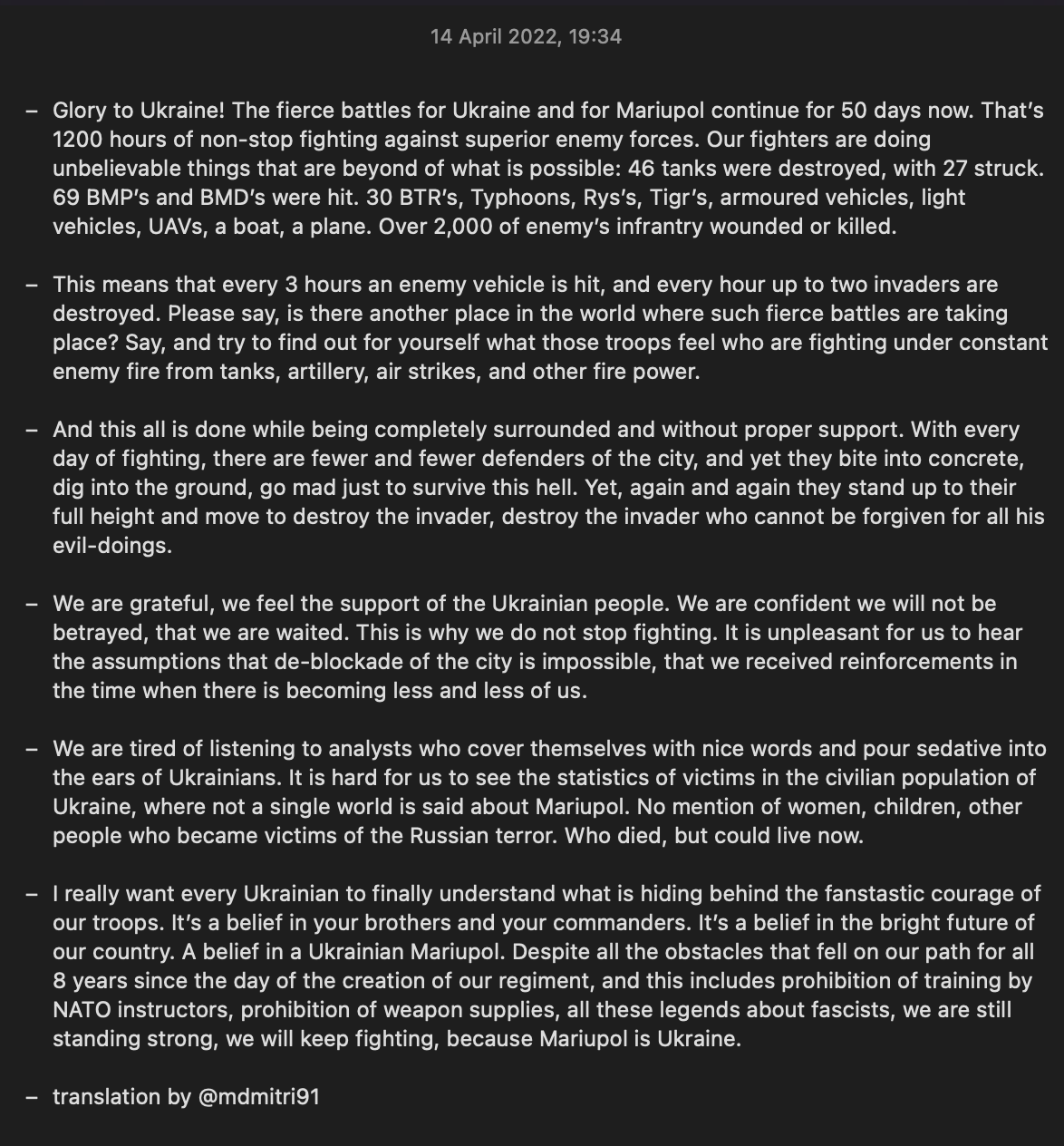 Aasovi rügemendi ülema asetäitja Svjatoslav Palamar, Kalina sõber, esines Mariupoli kaitsmise 50. päeval avalduse.