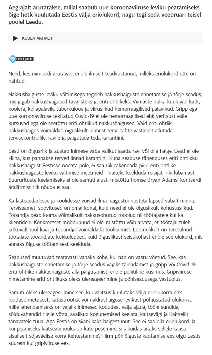 Ajakirjas Atlantic prognoosis Harvardi ülikooli viroloogiaprofessor, et on suhteliselt suur tõenäosus, et aasta jooksul saab 40–70% planeedi elanikkonnast koroonaviiruse. Oletame, et Eestis on kahe kuu pärast 50 000 nakatunut, 10 protsenti piisavalt raskelt, et vajavad haiglaravi. Ilmselgelt Eesti ei ole selleks valmis ja tegelikult isegi ei valmistu selleks?