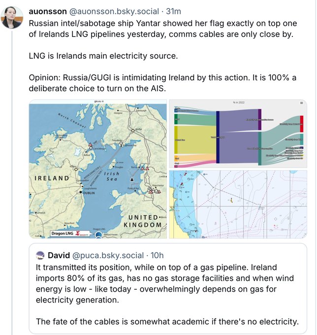 As you can see in the below images, it is moving around the exact location of sensitive underwater cables, notably passing over one of the LNG pipelines between Ireland and the UK.