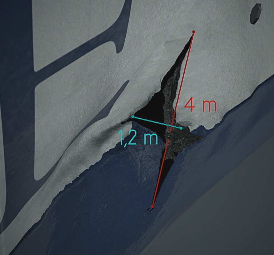 Kas kaasfoorumlastel on kahtlusi, et reaalsed videokaadrid paljastavad natuke teistsuguse deformatsiooni kui discovery poolt nende põhjal pandud ilupilt näitab? Iseenesest me võime siin ju järgmise "Kavastu" tekitada aga insenerina välistaks küll selle et selline deformatsioon tekib lihtsalt laeva ebaühtlasel pinnasel lebamisest laeva enda raskuse mõjul. Tegemist on muljumisdeformatsiooniga mille tagajärjel tekis peatõmbepingete mõjul piki ja ristirebendid, tegemist võib olla nii tömbi kui terava esemega kuid mõõtmetelt mitte väga suurega. Ka tõesti, vajumine kivi otsa võiks sellise tekitada.