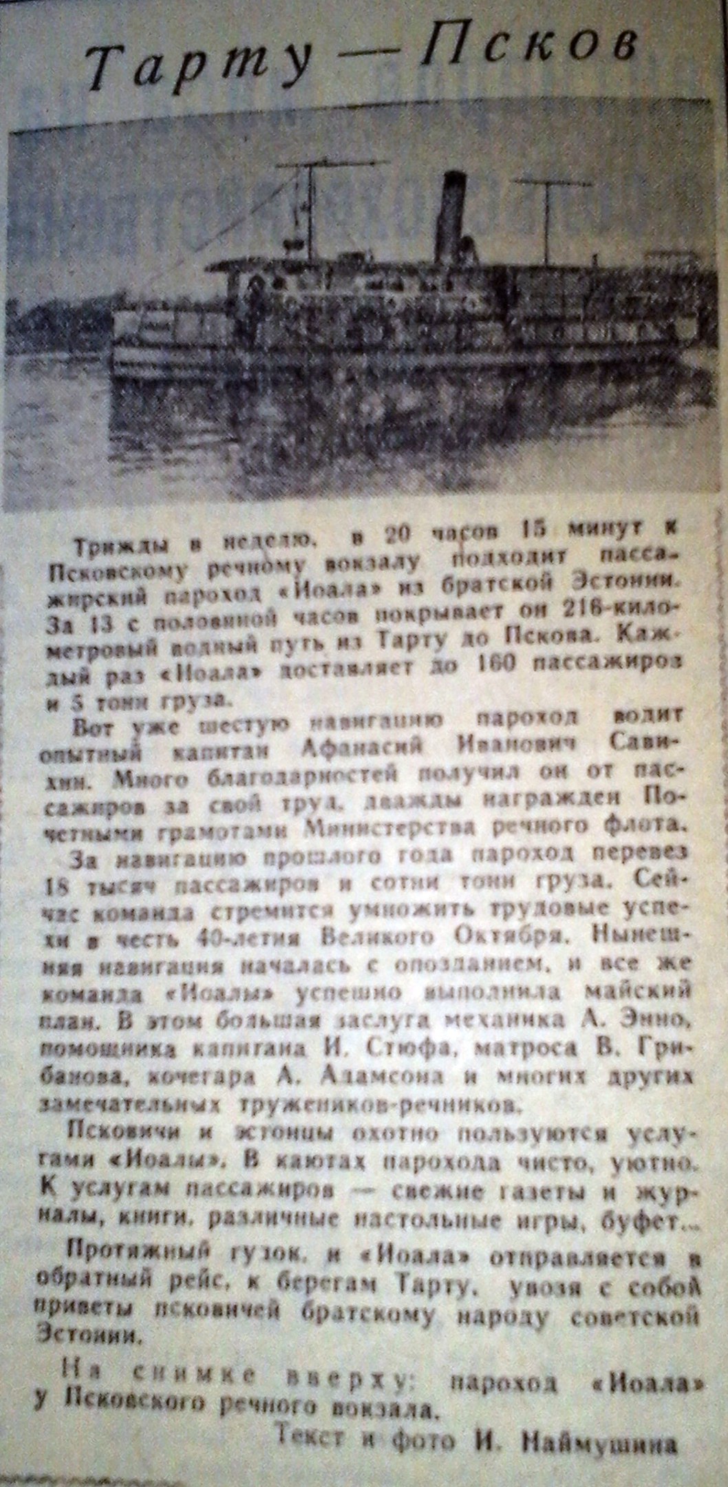 Ja ujuvveranda oligi mõnikord suviti kasutuses! Oli köietatud kas "M-258" või mõne puksiiri külge. "Pravdat" ei saanud aluse kehvema manööverdusvõime tõttu kasutada. Aga muuseas selgus, et "Pravda" ametlik kodusadam oli vähemalt 50-tel aastatel Tartu, ehkki ta emajõelinna loomulikult kunagi ei sattunud.aurik kirjutas:Veel paar pilti Narva kandist. Koos täpsustatud infiga laevade kohta. "M-258" Foto aastast 1976. Keegi naljavend on üritanud vist värvifotoks kujundada ja pärast esimese juti tõmbamist ümber mõelnud .