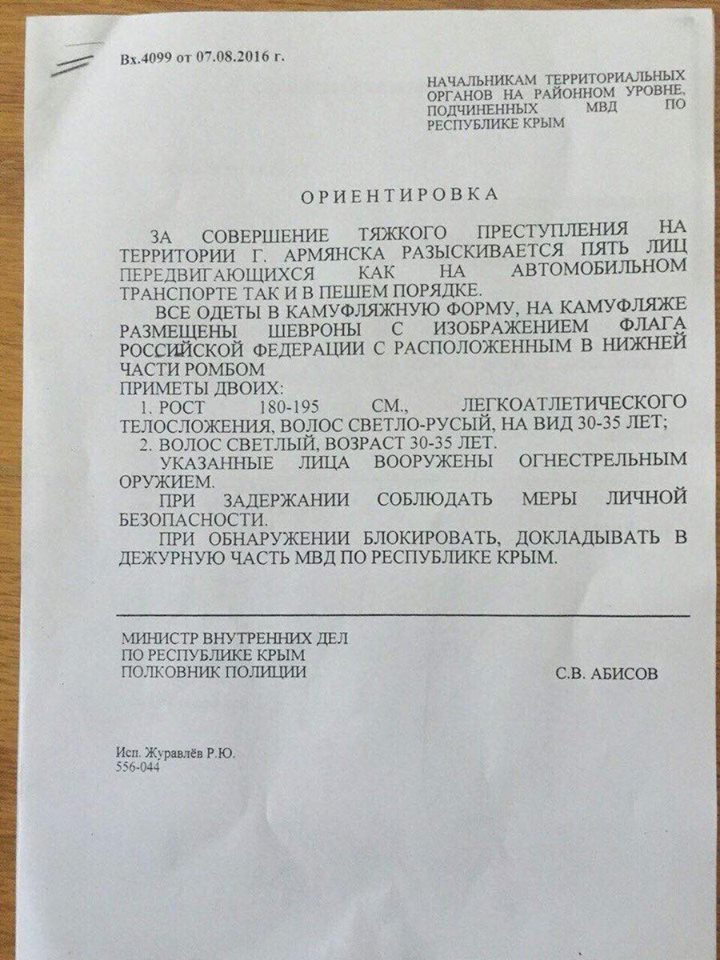 Vene kommentaariumites arvatakse (Strelkovi jutule tugindes, aga ei otsinud seda Strelkovi algteadet veel siiski), et 2 pravosekkide diversioonigruppi tungis Krimmi (4 vene sõjaväelast olla surma saanud, vist mikroautobusis), üks diversioonigrupp veel tegutsevat (sellest see Armjanski linna kuulutus raske kuriteo kohta ja 4 mehe otsimise kohta) - et meestel vene sõjaväevormid, aga mingid rombid jne ei ole enam vene sõjaväes kasutusel. Et ei ole tegemist desertööridega, sest vanus suurem.Miki kirjutas:Neli vanti väest plehku pannud, arvatakse kogu jama piiril sellepärast..