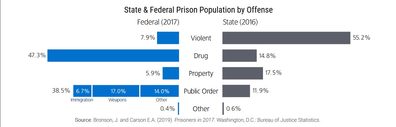 Eri osariikide vanglates on vägivalla eest istujate arv kõrgem, föderaalvanglates istutakse rohkem narko eest.