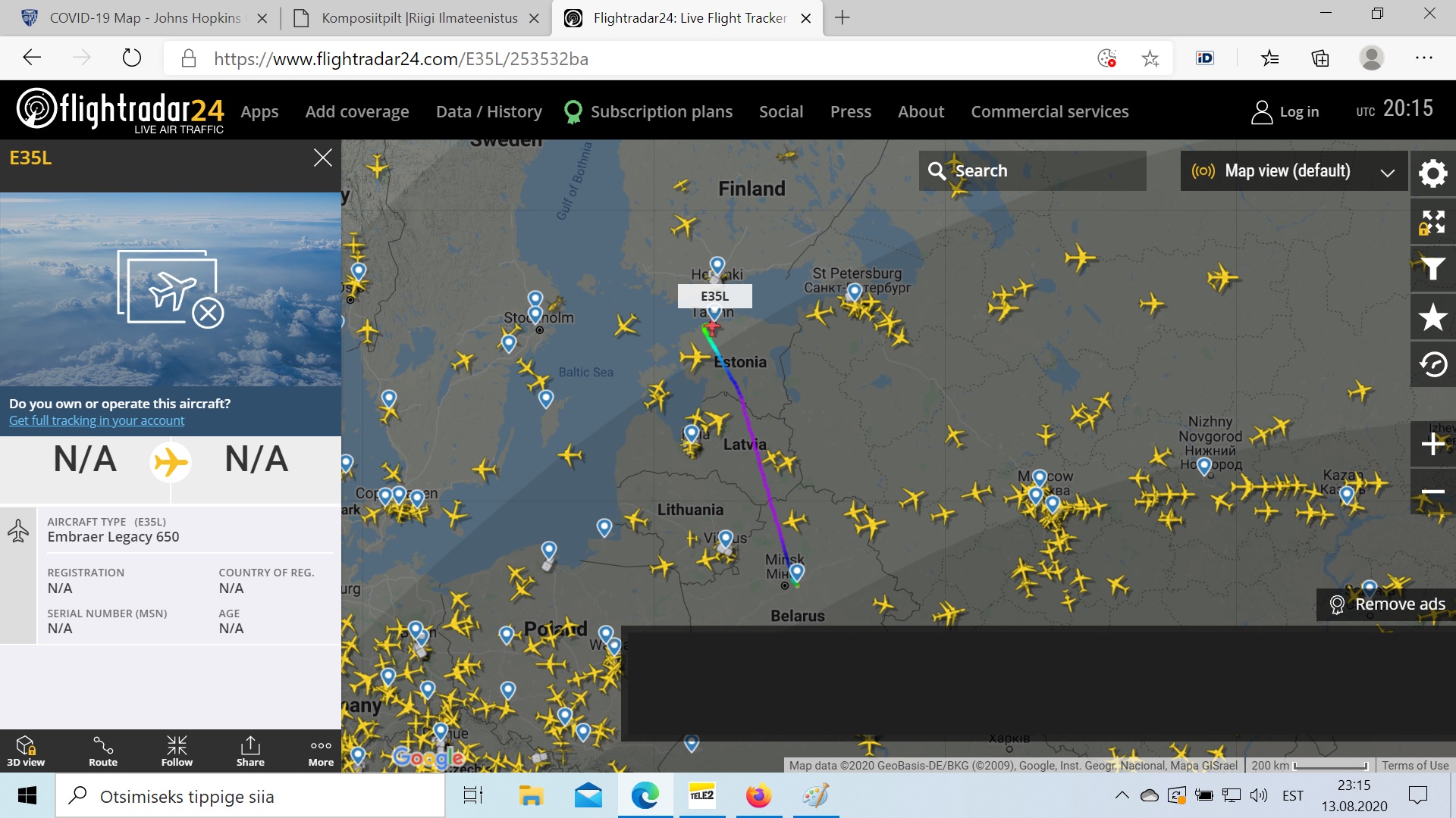 Huvitav jah, Embraer Legacy 650 nende hingekirjas justkui tõesti pole: https://sirius-aero.ru/en/fleet/hjl85 kirjutas:Huvitav. Sellise nr E35L annab, et on Emraer 600 ja kuulub Sirius AeroleManurhin kirjutas:Maanduski. Huvitav, kas mõni rott üritab Tallinna kaudu uppuvalt laevalt lahkuda?Manurhin kirjutas:Vaadates Flightradar 24, tundub, et üks Minskist startinud lennuk hakkab varsti Tallinnas maanduma. Muid andmeid lennuki kohta ei näita, ainult seda, et lennuk on Embraer Legacy 650.