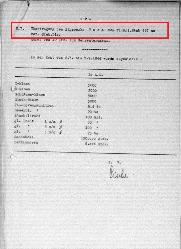 AOK pioneeriüksuste juhi aruanne 11.07.1944 annab teada, et 08.07.1944 anti Vara saeveski Pi.Reg.Stab 667 käsutusse.