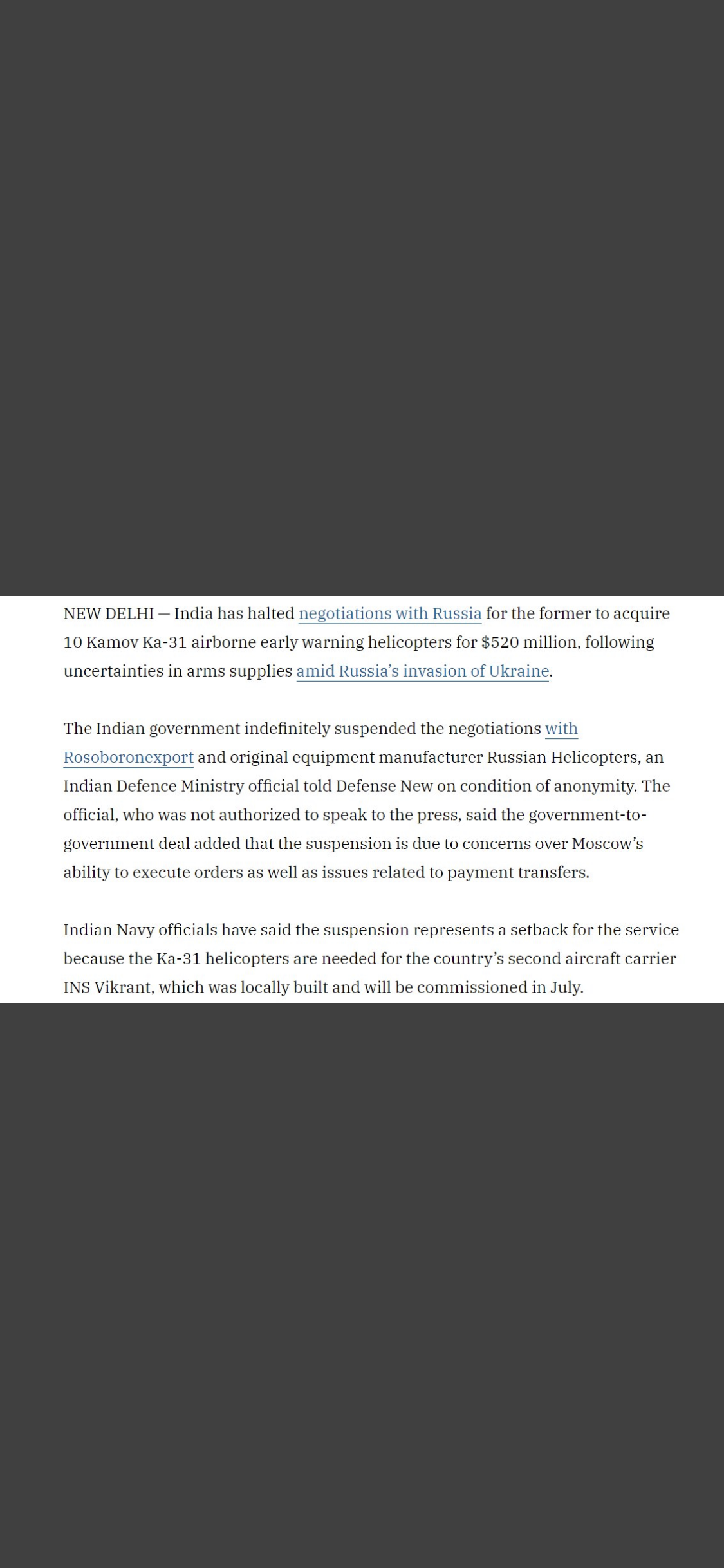 "India has halted negotiations with Russia for the former to acquire 10 Ka-31 airborne early warning helicopters for $520 million, following uncertainties in arms supplies amid Russia’s invasion of Ukraine." According to an Indian Defense Ministry official