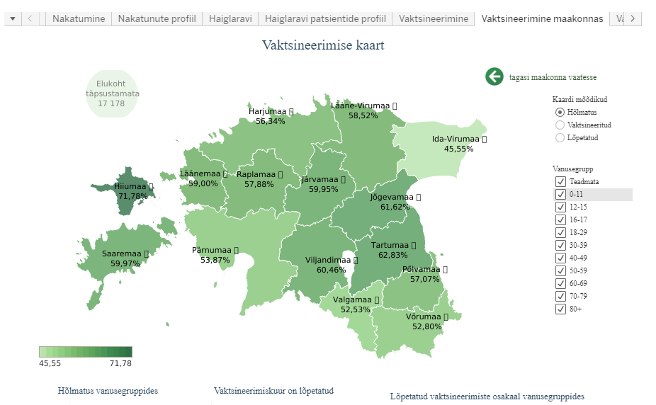 Tänase seisu järgi on Terviseameti andmetel 12+ vaktsineeritus Tartu maakonnas 74%. 80-nest on asi veel väga kaugel. Nakatumist veavad 5-19 aastased. Kogu elanikkonnast on Tartumaal 63% vaktsineeritud.