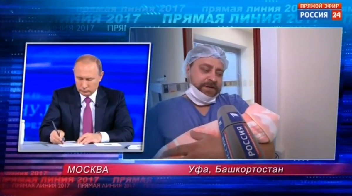 Baikali järves asuva Olhoni saare elanikule pistetakse Rossija-1 ajakirjaniku mikker näkku ja kuulda saab põhjalikku nurinat selle üle, kuidas saarele on võimatu pääseda, sest teed on kohutavad. Putin teeb märkmeid ja lubab aidata. Seejärel siirdub videopilt Baškortostani Vabariigi pealinna Ufa sünnitushaiglasse, kus kaamera võtab sihukule värske isa Artjomi, kes, vastsündinu süles, pälvib õnnitlused presidendilt endalt. Samal ajal, kui Artjom räägib, teeb Putin märkmeid.