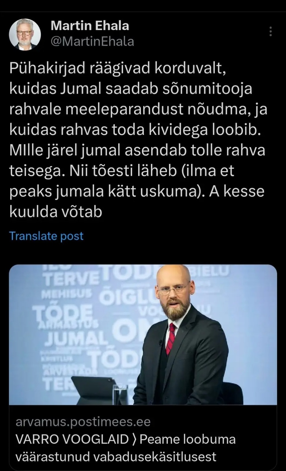 aj1972 kirjutas: 17 Juun, 2024 22:04 Vanasti oleks Varro jumalasõna tänavanurgal jutlutanud või kui viitsimist käinud külast- külla oma sõnumitega,