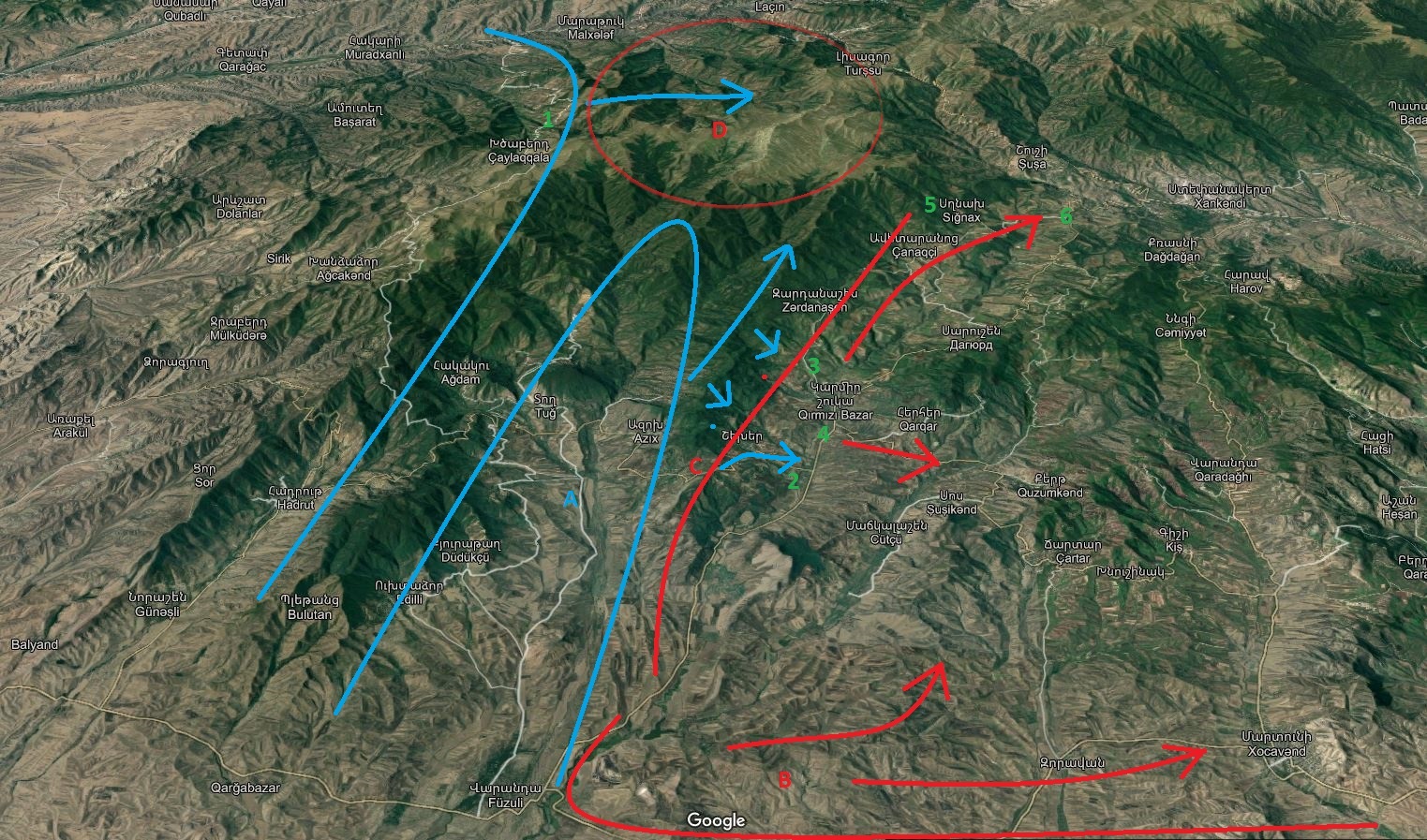 Paistab nagu aserid muukisid järgmise oru lahi ja nüüd on võimalik piki orgu pressida nii Susha, Hankendi, kui Latšinini. Kindlusrajoon B peab taktikalistel kaalutlustel positsioone õgvendama. Kui aserid jõuavad Susha juures Latšini trassini, siis piirkond D kaitsmine ei oma enam strateegilist tähtsust. Kui Latšini läheb kinni, siis Armeeniaga saab veel ühendust Kelbatšaari trassi kaudu, kuigi aserid ulatuvad ka seda oma rakettidega kottima.