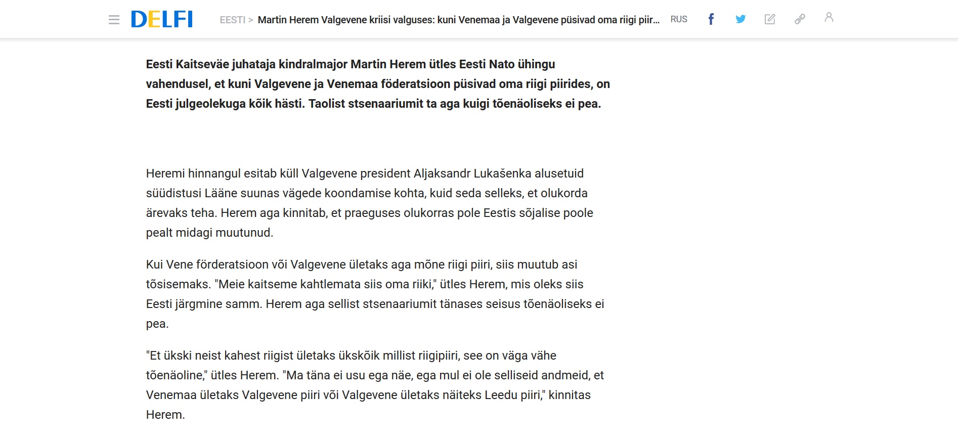 Äää! Vii aar ool gonna daaaiiiEesti Kaitseväe juhataja kindralmajor Martin Herem ütles Eesti Nato ühingu vahendusel, et kuni Valgevene ja Venemaa föderatsioon püsivad oma riigi piirides, on Eesti julgeolekuga kõik hästi. Taolist stsenaariumit ta aga kuigi tõenäoliseks ei pea.