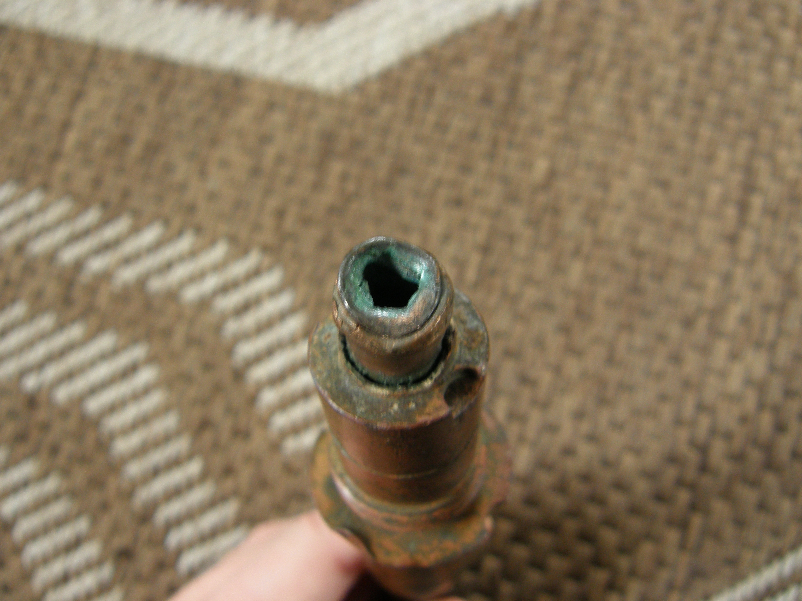 Noh, kui disainiks ostad ainult selgelt ohutuid palvankasid või kiivreid, kaste või muud sellist, siis ei näe põhjust, miks see peaks vähem rahulikum olema kui näiteks markide kogumine. Aga jah, ikka ostad mida tead, aga see sütik oli küll ilma täpse teadmiseta soetatud, kuna oli kirjas, et ohutu ning nägi huvitav välja. Aga arvan ise ka, et ta on täiesti ohutu, asi nüüd käes ka. Loodan samuti, et see asi selgelt mingit ohtu mitte kujutavana siis kedagi ka ei häiri. Panen veel mõned täpsemad pildid alumisest otsast, sealt on näha, et ots kus detonaator kinnitub on deformeerunud plahvatusest ning põhjas ka plekk deformeerunud, mis sisemisse kanalisse tee avab. Seega sealt see tuli pidi sees käima ja ka selle tongi läbi lööma. Küljelt on ka väikese matsu saanud, vask on muljutud.