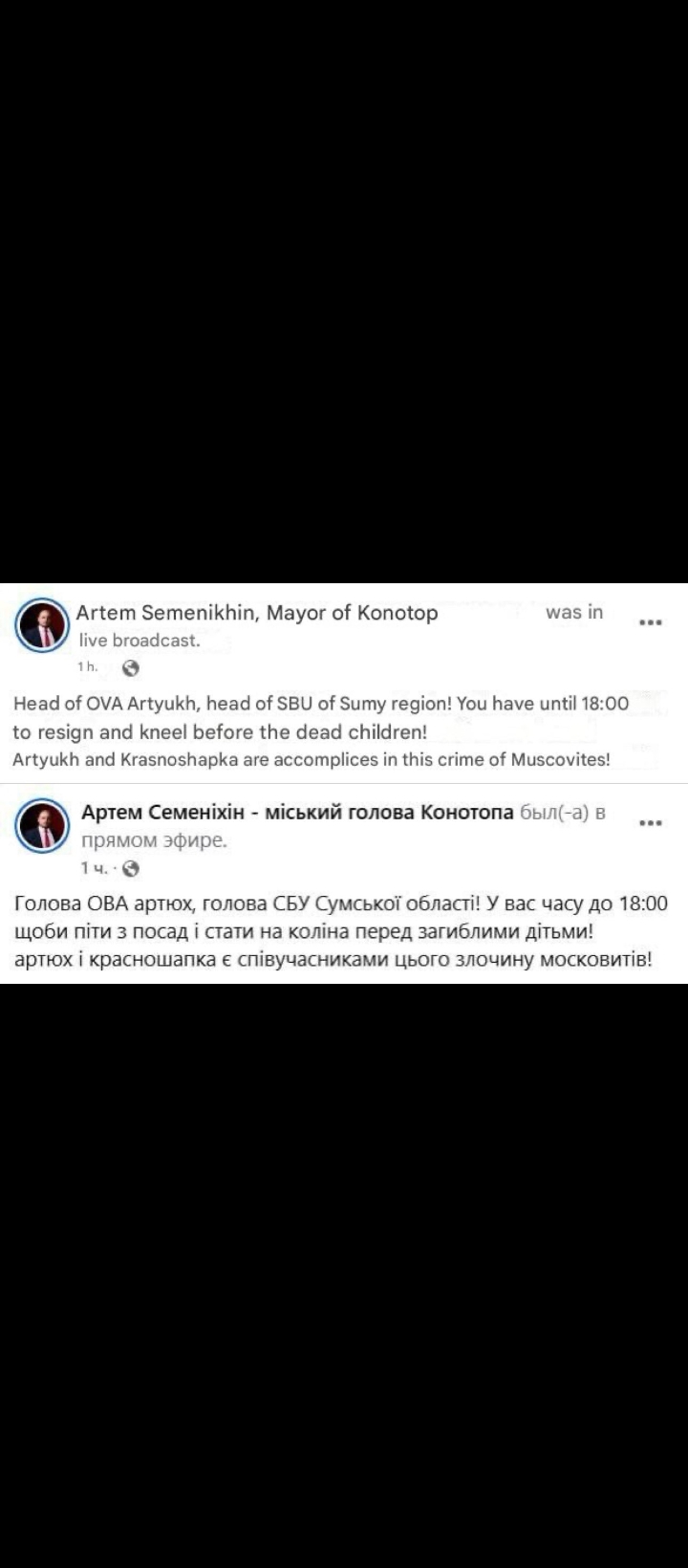 „Nii palju aidata katsaapidel oma sisuliselt genotsiidi Ukraina rahva vastu õigustada tuleb osata. Täna toimus just siin moskalide terroriakt ukrainlaste vastu. Ja Sumõ oblasti sõjaadministratsiooni juht, Nõukogude kindral Artjuhh aitas neile selles kaasa. Võimaldas neil oma terrorirünnakut, genotsiidirünnakut meie, ukrainlaste vastu õigustada,“ ütles Semenihhin.