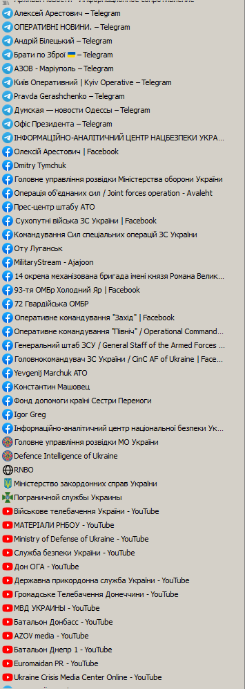 Nii on näiteks Ukraina Kaitseministeeriumil, armee peastaabil, maavägede- õhujõudude- jne peastaapidel, piirikaitseteenistusel, üksikutel brigaadidel/polkudel, luurepeavalitsusel, SBU-l, ühendvägede operatsioonistaabil, kaitseministril, UKR armee juhatajal, siseministeeriumil ja siseministril, presidendil ja tema nõunikel jne jne kõikidel sotsiaalmeedias oma ametlikud kontod, kus pidevalt infot edastatakse/sisuga täidetkase. Valdaval osal neist on samaaegselt kontod nii Facebookis, Twitteris, Telegrammis... kui suurel osal lisaks YouTubes... kõikidel on lisaks ametlikud veebilehed.