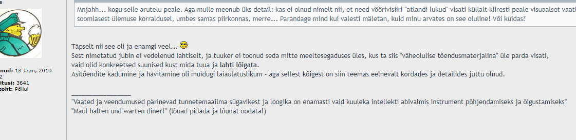 Mitte soomlane vaid rootslane.krijgsvolk kirjutas:Mnjahh... kogu selle arutelu peale. Aga mulle meenub üks detail: kas ei olnud nimelt nii, et need vöörivisiiri "atlandi lukud" visati küllalt kiiresti peale visuaalset vaatlust, miski soomlasest ülemuse korraldusel, umbes samas piirkonnas, merre... Parandage mind kui valesti mäletan, kuid minu arvates on see oluline! Või kuidas?