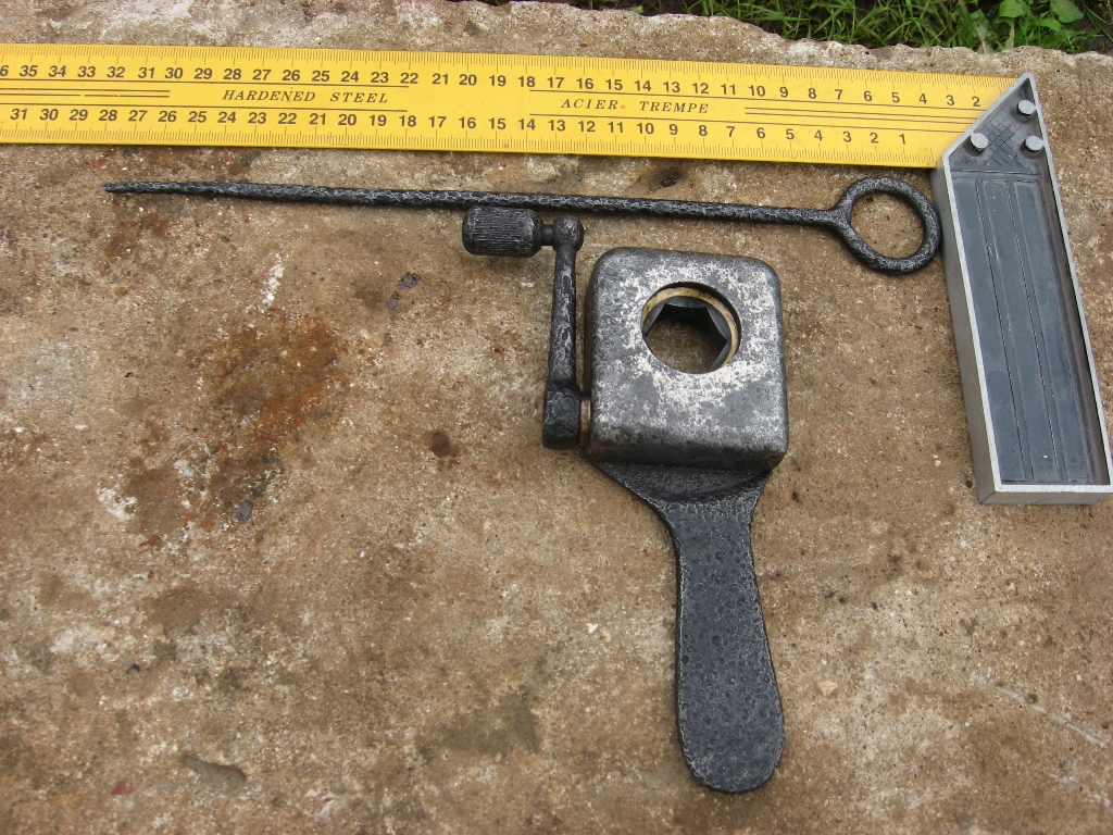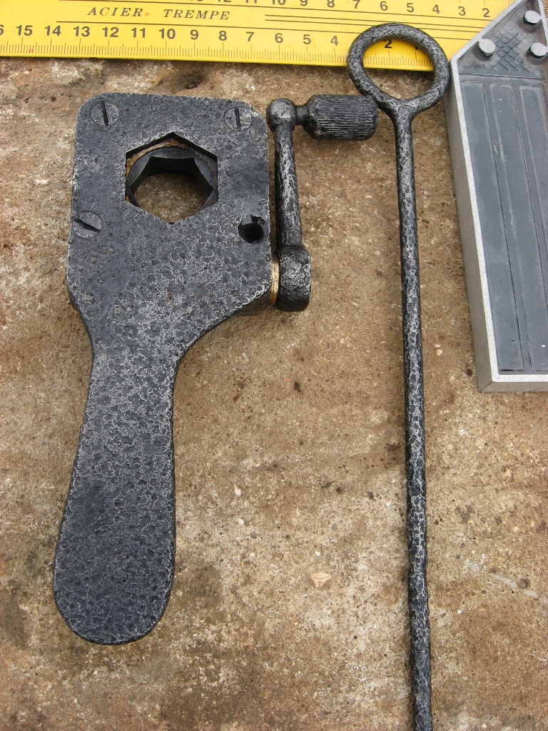 Võiks arvata, et miskisugune sütiku seadmise võti, aga mulk keskel liiga väike selleks. Ju siis krutiti sellega nurga taga asuvaid mutreid. Võibolla polegi militaarset päritolu.